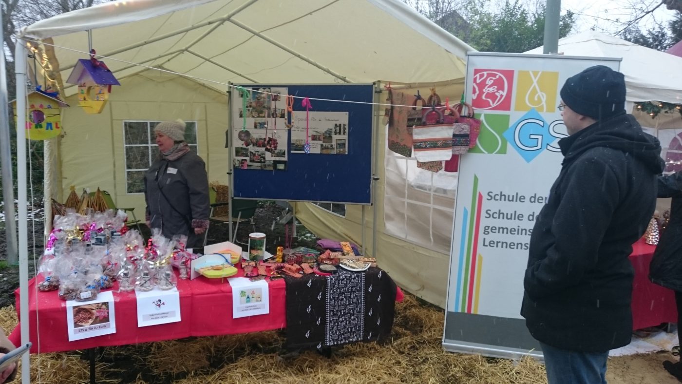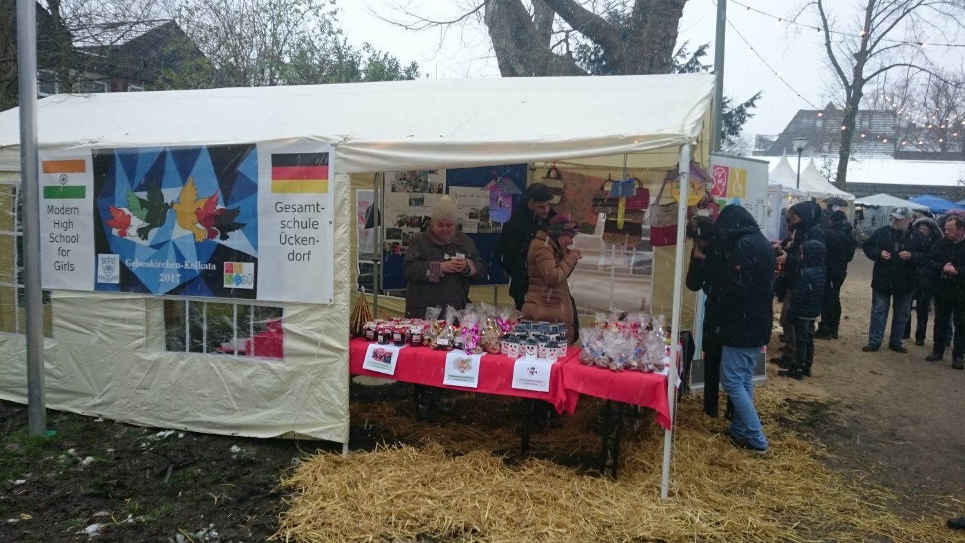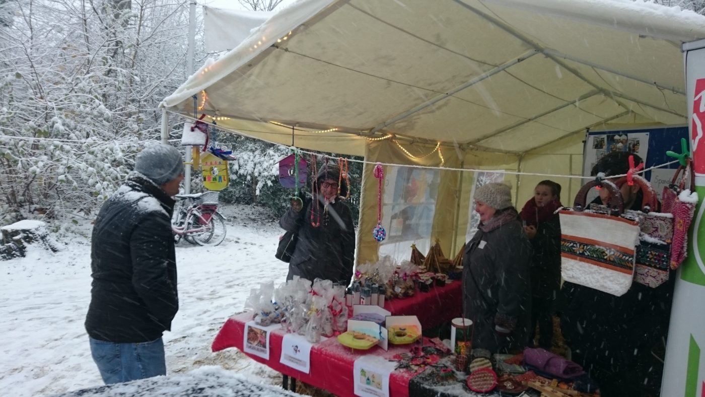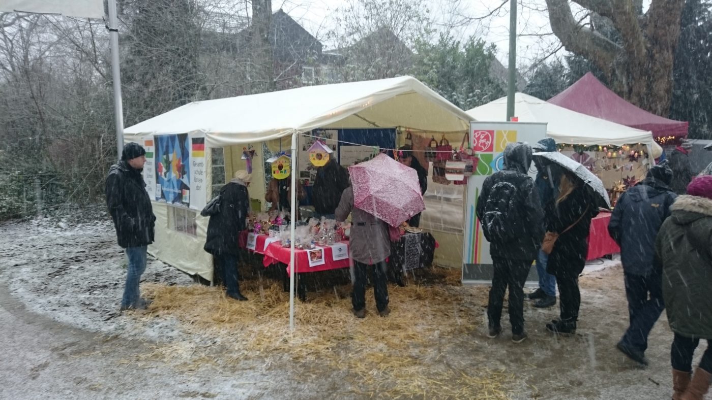 Alles war gut vorbereitet, in der Küche wurden Mandeln gebrannt, Marmelade eingekocht, Kekse gebacken und essbare Weihnachtsmänner vorbereitet. Aus Technik und Kunst kamen dann noch Vogelfutterhäuschen, Holz-Schneemänner und weiteres Dekomaterial dazu. Aus Indien hatten die Austauschteilnehmer Taschen, Tücher, Schmuck und vieles mehr mitgebracht. Der Stand war zügig aufgebaut und zur Eröffnung durch den Oberbürgermeister war alles bereit. Nur das Wetter hatte seine Hausaufgaben nicht gemacht. Der einsetzende Schneefall sah schön aus, hinderte aber wohl einige Menschen im Stadtteil am Besuch des Marktes.