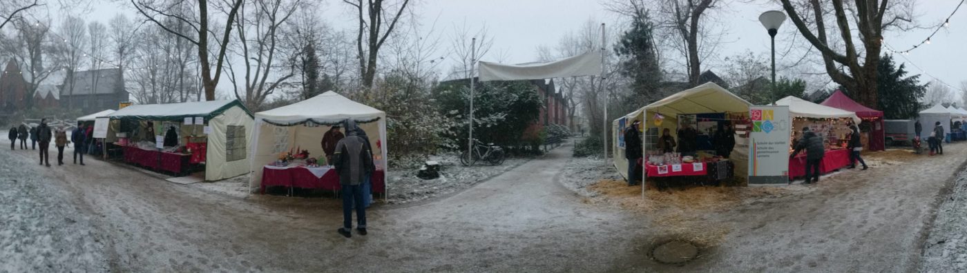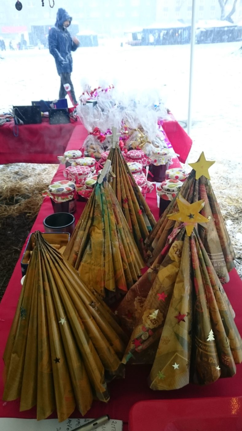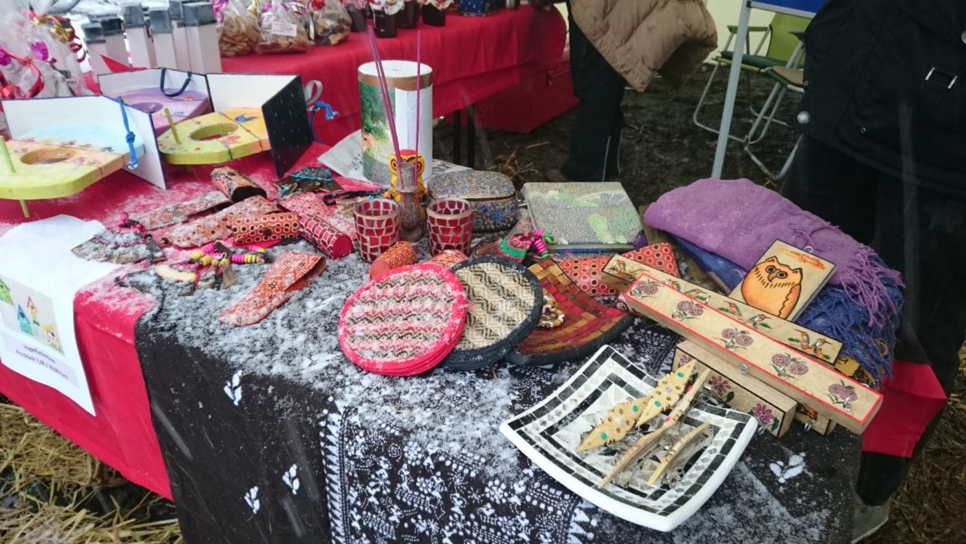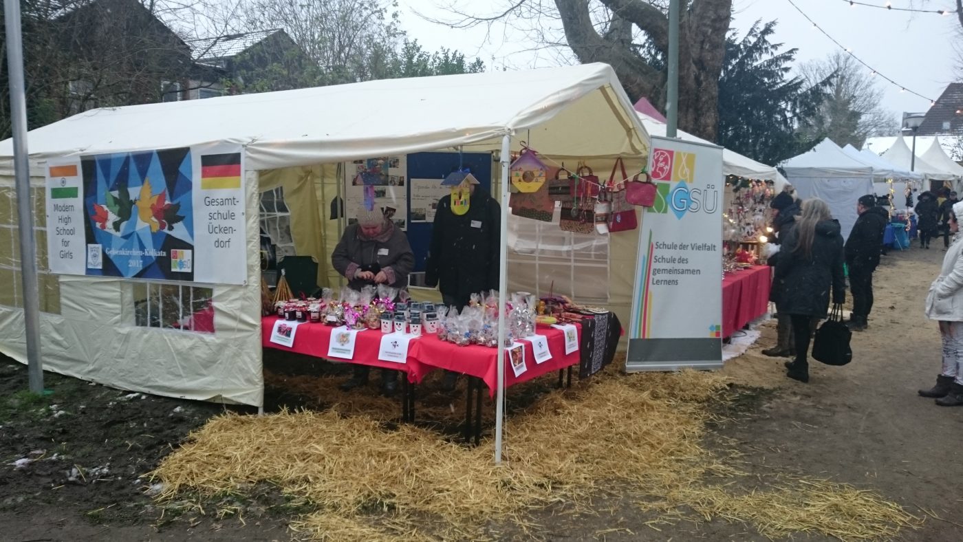 Alles war gut vorbereitet, in der Küche wurden Mandeln gebrannt, Marmelade eingekocht, Kekse gebacken und essbare Weihnachtsmänner vorbereitet. Aus Technik und Kunst kamen dann noch Vogelfutterhäuschen, Holz-Schneemänner und weiteres Dekomaterial dazu. Aus Indien hatten die Austauschteilnehmer Taschen, Tücher, Schmuck und vieles mehr mitgebracht. Der Stand war zügig aufgebaut und zur Eröffnung durch den Oberbürgermeister war alles bereit. Nur das Wetter hatte seine Hausaufgaben nicht gemacht. Der einsetzende Schneefall sah schön aus, hinderte aber wohl einige Menschen im Stadtteil am Besuch des Marktes.