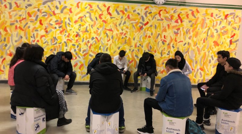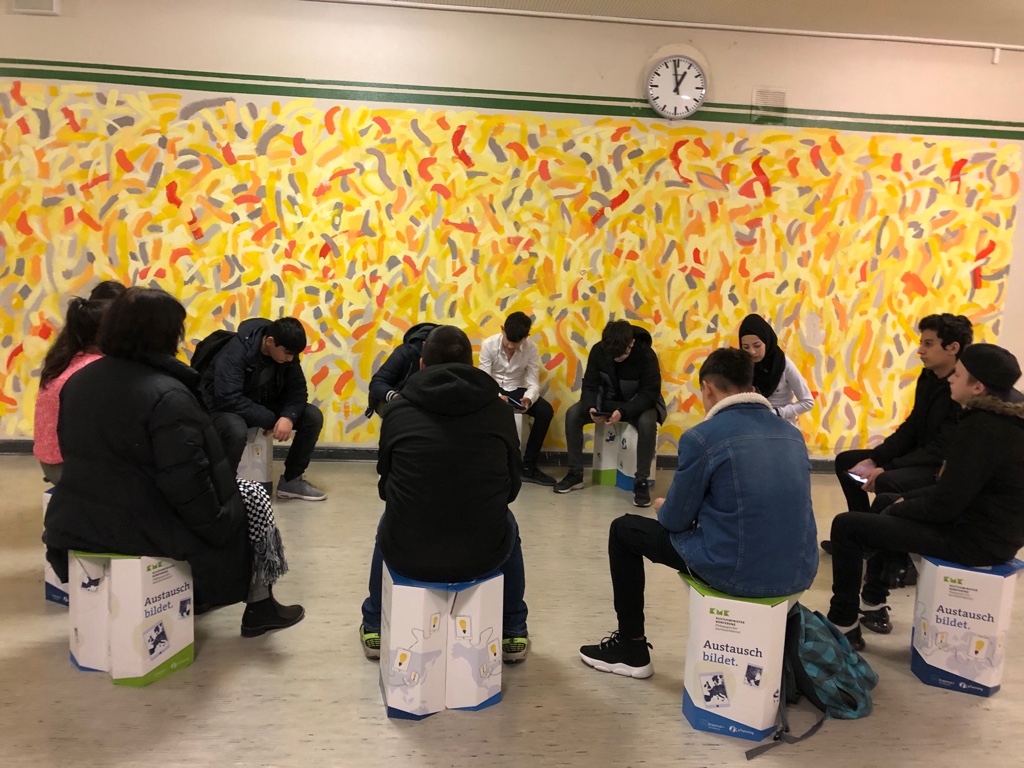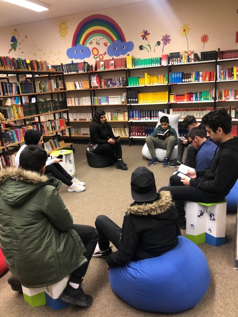 Dieses Jahr beteiligten sich bundesweit ca. 700 000 Vorleserinnen und Vorleser und auch die Bücherei Buddys (Serhat Baysal 9.6, Adrian Ortiz Alvarez 9.3, Nico Paulus 9.3, Dzhafer Minchev 9.3, Kerem Sencimen 9.3) waren wieder dabei. Sie haben zuerst vor dem Mosaik und im Anschluss in der Bücherei aus dem Buch “Die Wilden Fußballkerle” vorgelesen.
