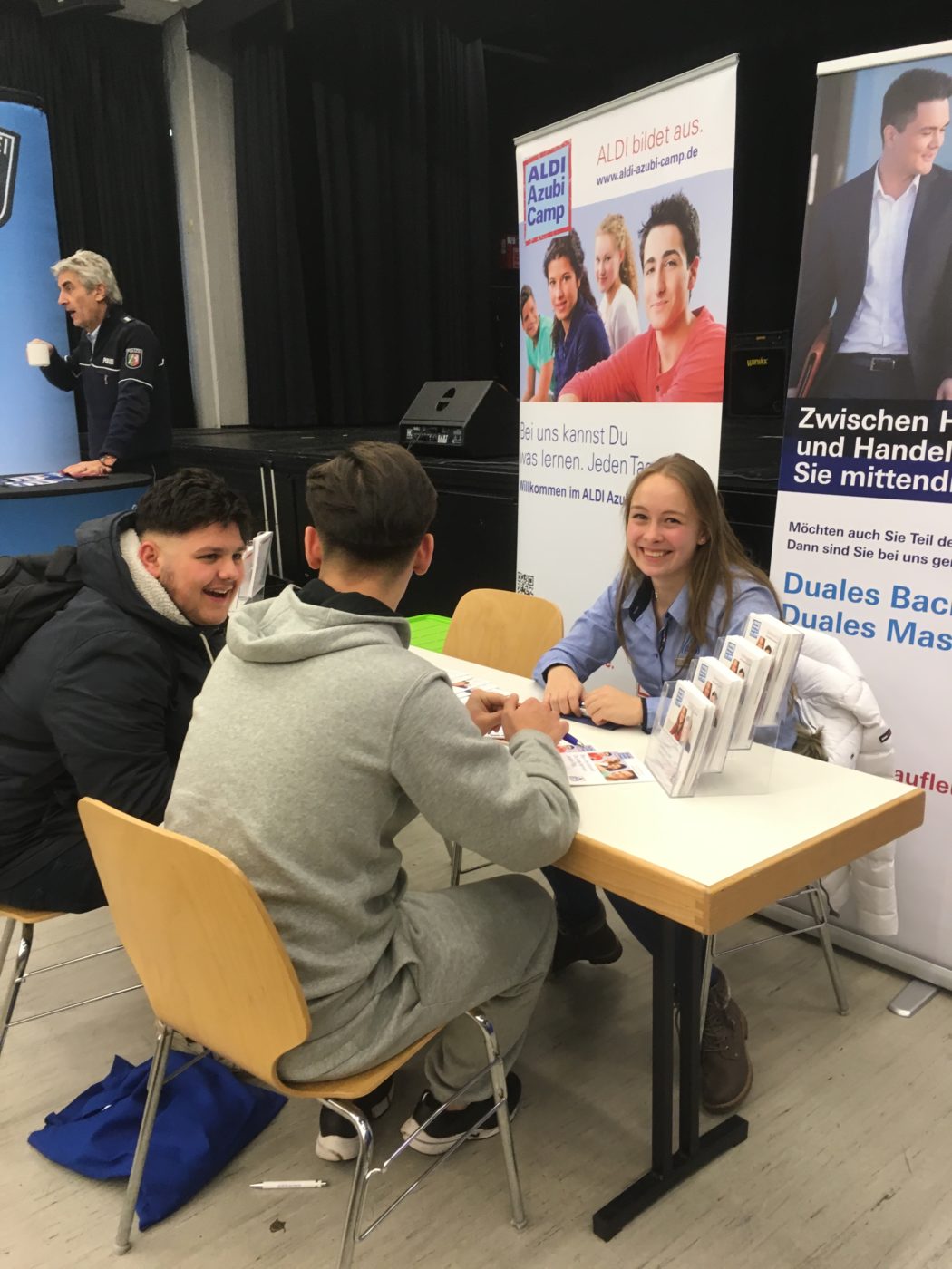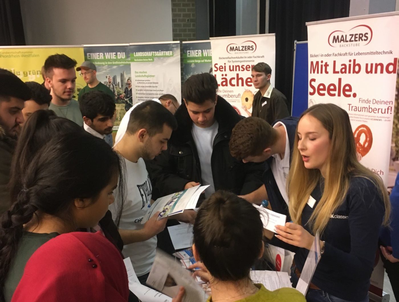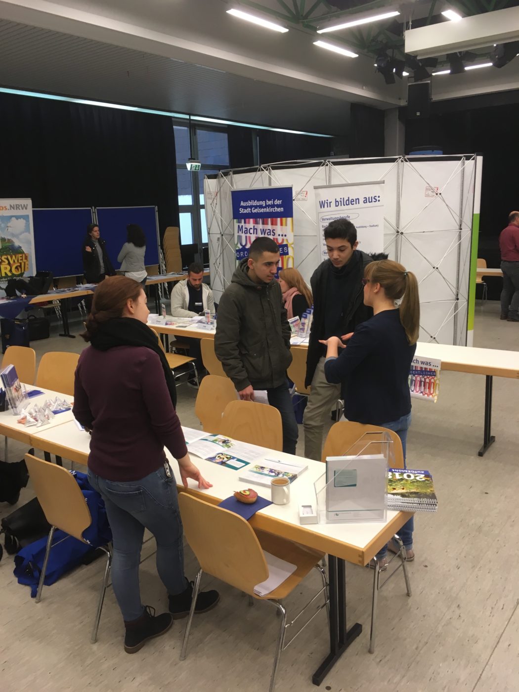 Am 10.1.2018, diesmal ein wenig früher als sonst, fand der diesjährige Berufemarkt in der Aula der Gesamtschule Ückendorf statt. In Zusammenarbeit mit der Berufseinstiegsbegleiterin von dem Bildungszentrum des Handels Frau Weiner und dem Berufseinstiegsbegleiter Herr Schlüter vom Grone Bildungszentren NRW wurden viele namhafte Firmen angesprochen, von denen die folgenden Firmen bzw. Einrichtungen zugesagt haben und auch vertreten waren: