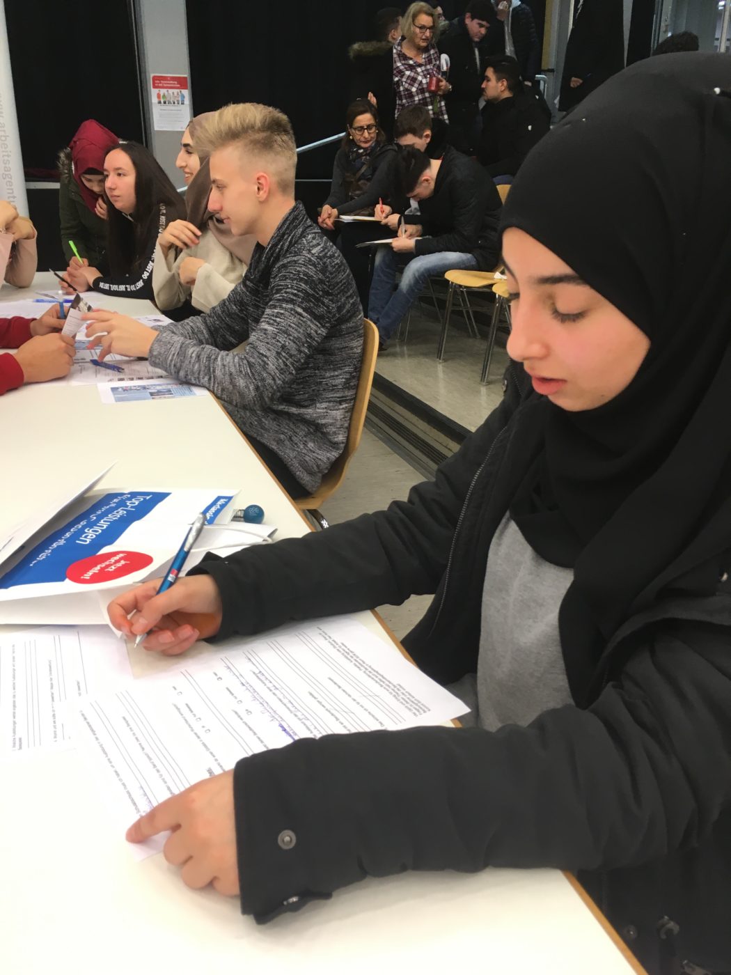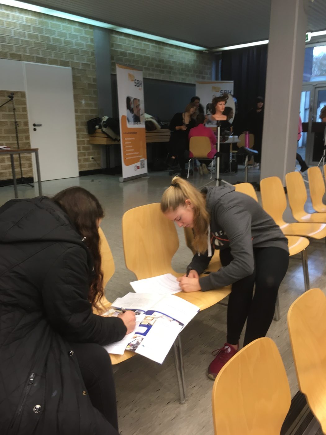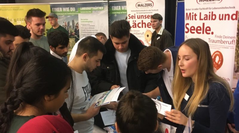 Am 10.1.2018, diesmal ein wenig früher als sonst, fand der diesjährige Berufemarkt in der Aula der Gesamtschule Ückendorf statt. In Zusammenarbeit mit der Berufseinstiegsbegleiterin von dem Bildungszentrum des Handels Frau Weiner und dem Berufseinstiegsbegleiter Herr Schlüter vom Grone Bildungszentren NRW wurden viele namhafte Firmen angesprochen, von denen die folgenden Firmen bzw. Einrichtungen zugesagt haben und auch vertreten waren: