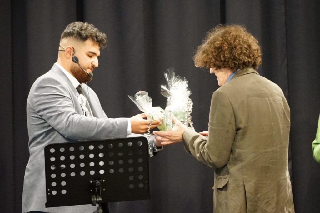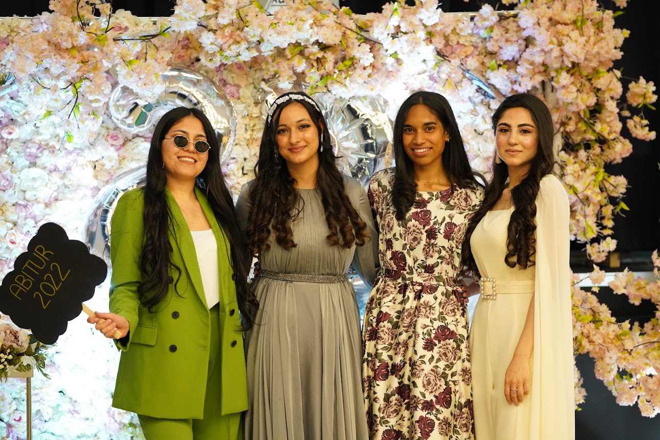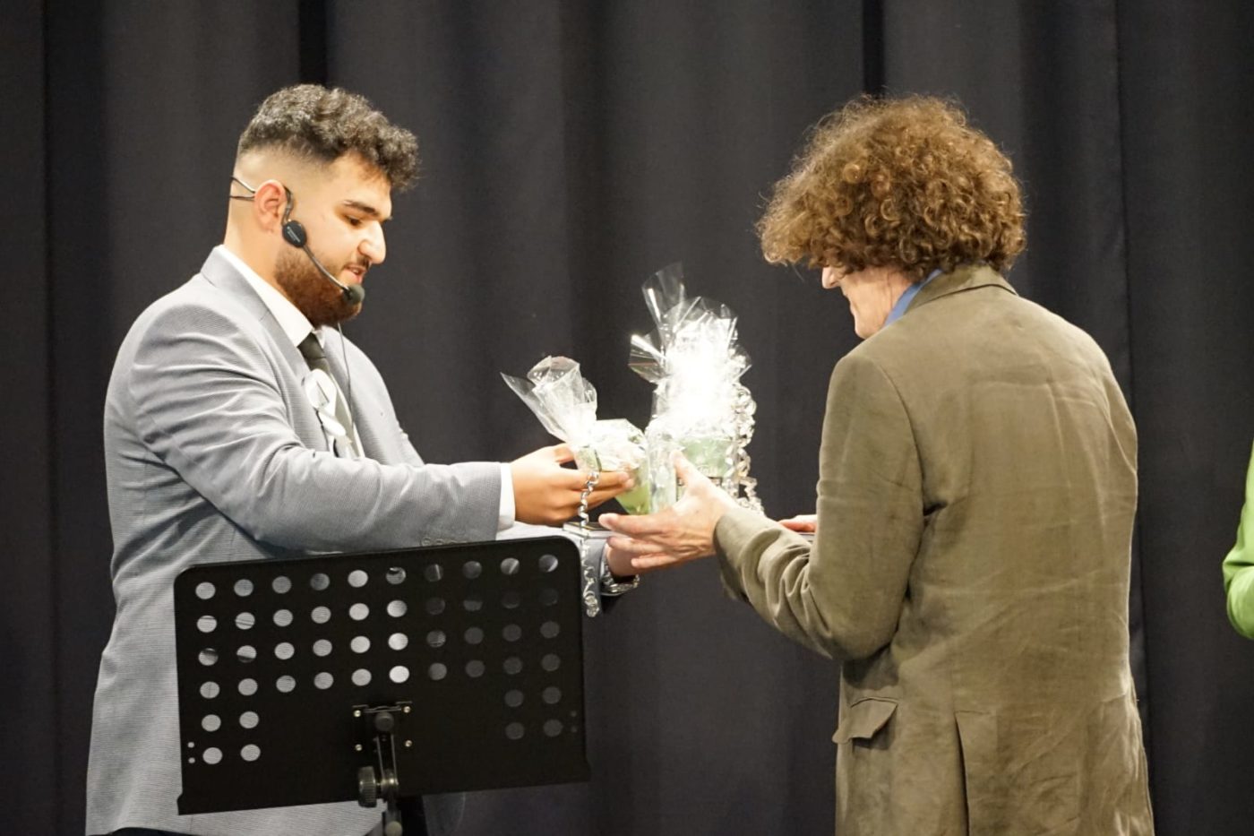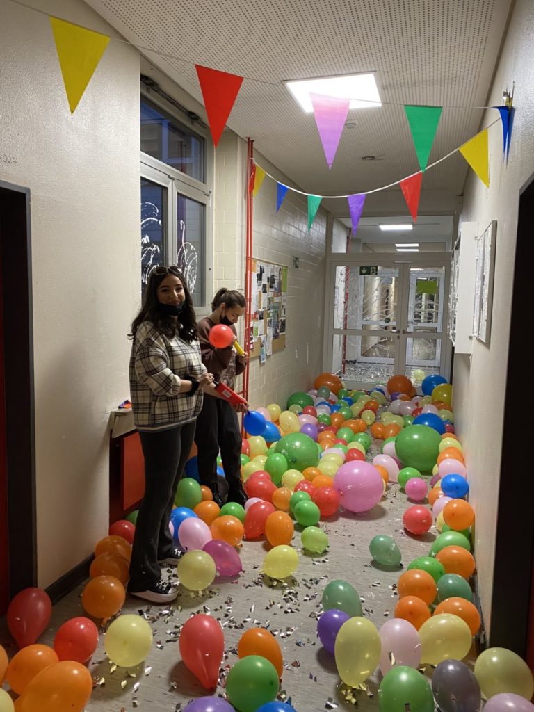 Große Stimmung kam auf, als das Publikum in einem Kahoot die Schüler*innen des Jahrgangs anhand von Kinderbildern identifizieren sollte. Abschließend erhielten die unterrichtenden Lehrer*innen noch kleine Präsente. Beim anschließenden Umtrunk im B-Foyer und auf dem Schulhof gab es dann noch die Gelegenheit für zahlreiche Erinnerungsfotos.
