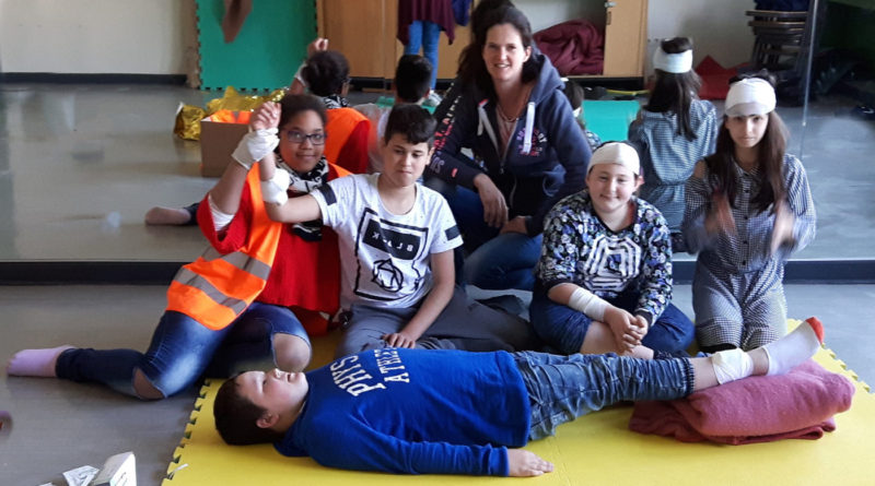 Immer mittwochs in der Mittagspause ist es soweit: Unter der Leitung von Frau Janicki trifft sich im „Spiegelraum“ auf C 2 die AG „Schulsanitätsdienst“ des 5.+6. Jahrgangs. Mit großem Eifer üben die Mädchen und Jungen Erste-Hilfe-Maßnahmen an Personen wie zum Beispiel das Anlegen von Druckverbänden und die Wundversorgung, aber auch Wiederbelebungsmaßnahmen an der Puppe sowie die korrekte Atemkontrolle stehen auf dem Programm.