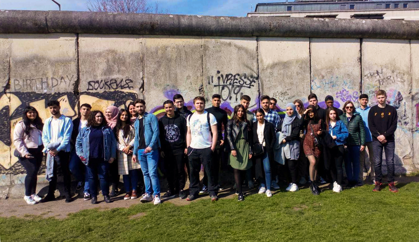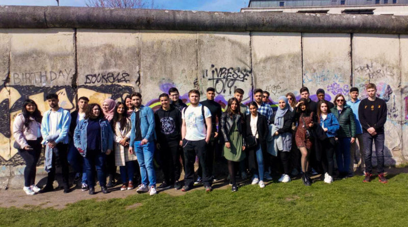Etwas munterer ging es dann zu Fuß weiter zum Holocaust Denkmal, welches bei einigen von uns beim Durchlaufen ein Gefühl von großer Bedrücktheit auslöste. Besonders das „Fangenspiel“ einer anderen Schülergruppe stieß auf großes Unverständnis und Wut auf unserer Seite: „Es ist ein Ort des Erinnerns und Gedenkens der Holocaust Opfer, ein solches Verhalten ist respektlos“. So kam es, dass jeder seinen Gedanken nachging, als wir unseren Weg fortsetzen, um die Überreste der “Mauer” anzuschauen. Der Fußweg dorthin sorgte bei einigen für kurzzeitiges „Gemaule“ und auf Seiten der Lehrer zu der Frage, ob sie tatsächlich mit der Oberstufe unterwegs seien. Bei den Mauerüberresten angekommen war der Fußweg schnell vergessen und alle bestaunten dieses Monument der deutschen Teilung. Die Bedeutung der Berliner Mauer und ihr Einfluss auf die Menschen in Berlin wurde sehr deutlich. Dieser Eindruck wurde nochmal verstärkt als wir vor der Tafel mit den Namen der Toten standen, die ihr Leben an der Mauer auf grausame Weise verloren haben.