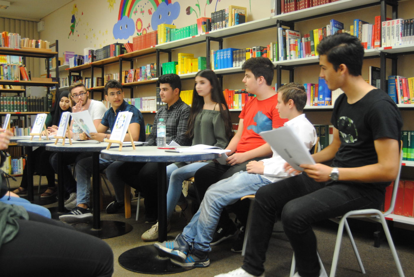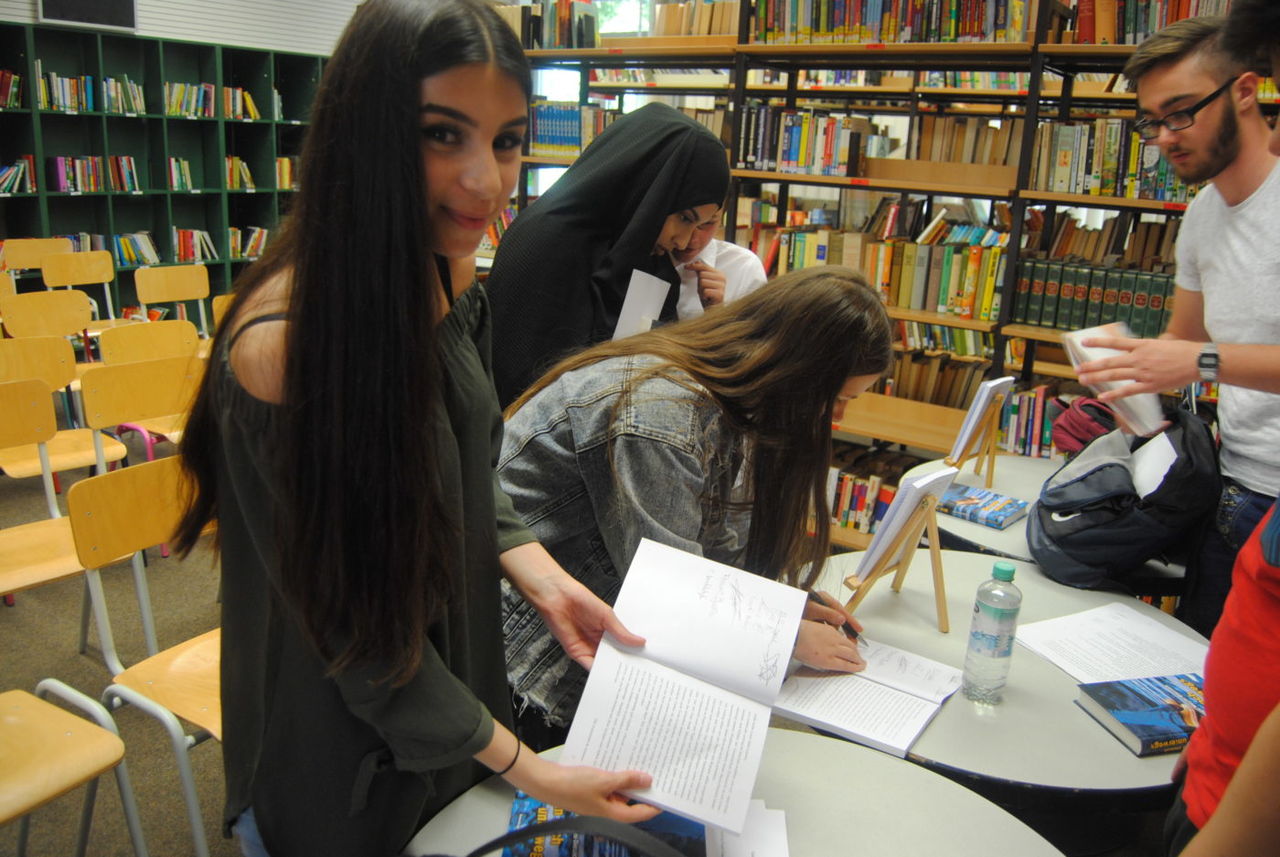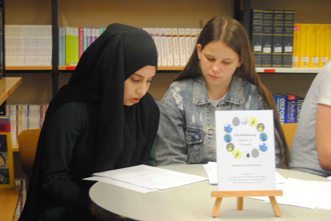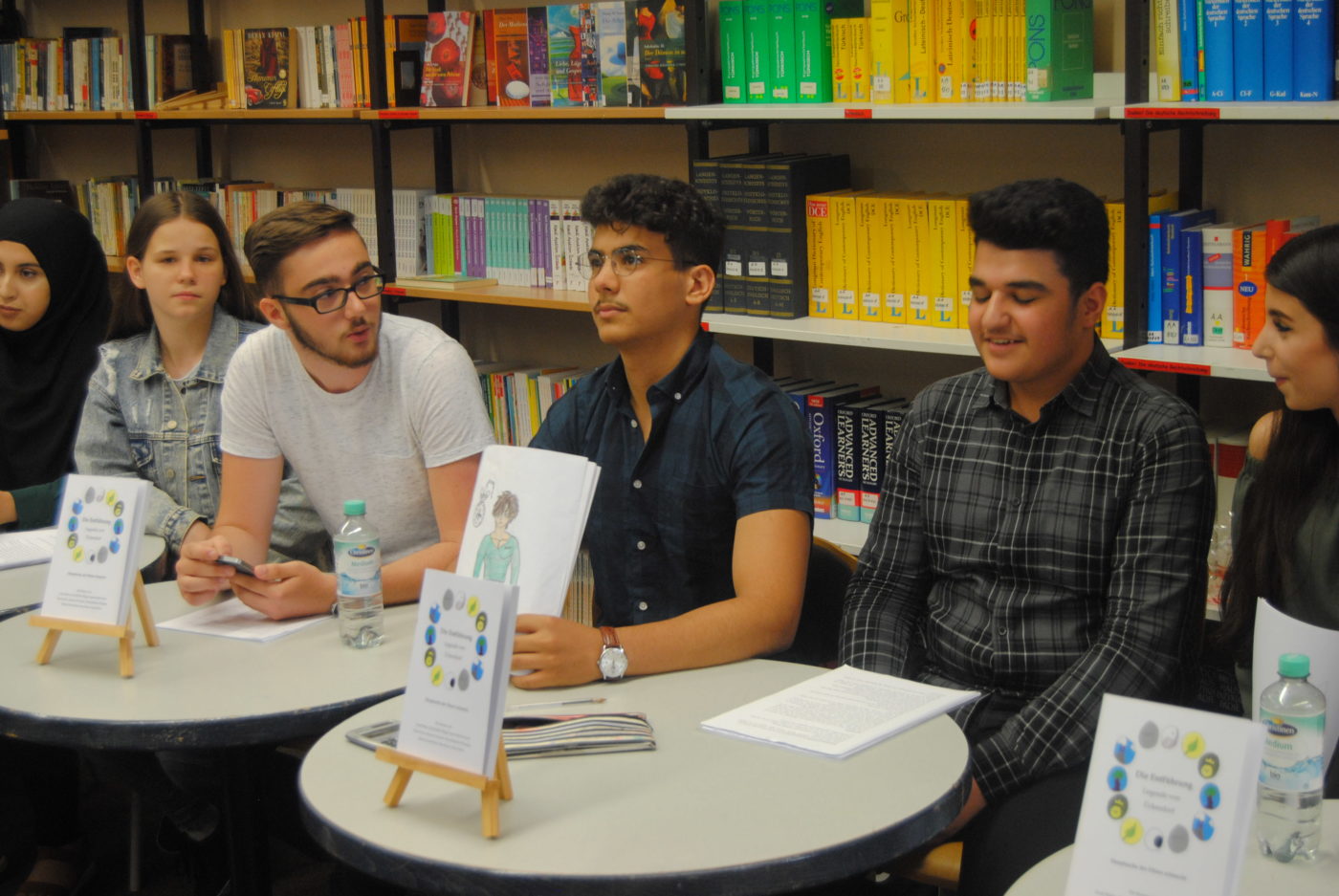 So beginnt der Roman „Die Entführung – Legende von Ückendorf“ aus der Schreibwerkstatt des 9. Jahrgangs, der am 3. Juli 2018 einem interessierten Publikum vorgestellt wurde. Die 9 Autorinnen und Autoren moderierten selbst die Vorstellung des Buches, gaben einen Einblick in die Arbeit des einjährigen Workshops und lasen Ausschnitte aus dem 200 Seiten umfassenden Roman.