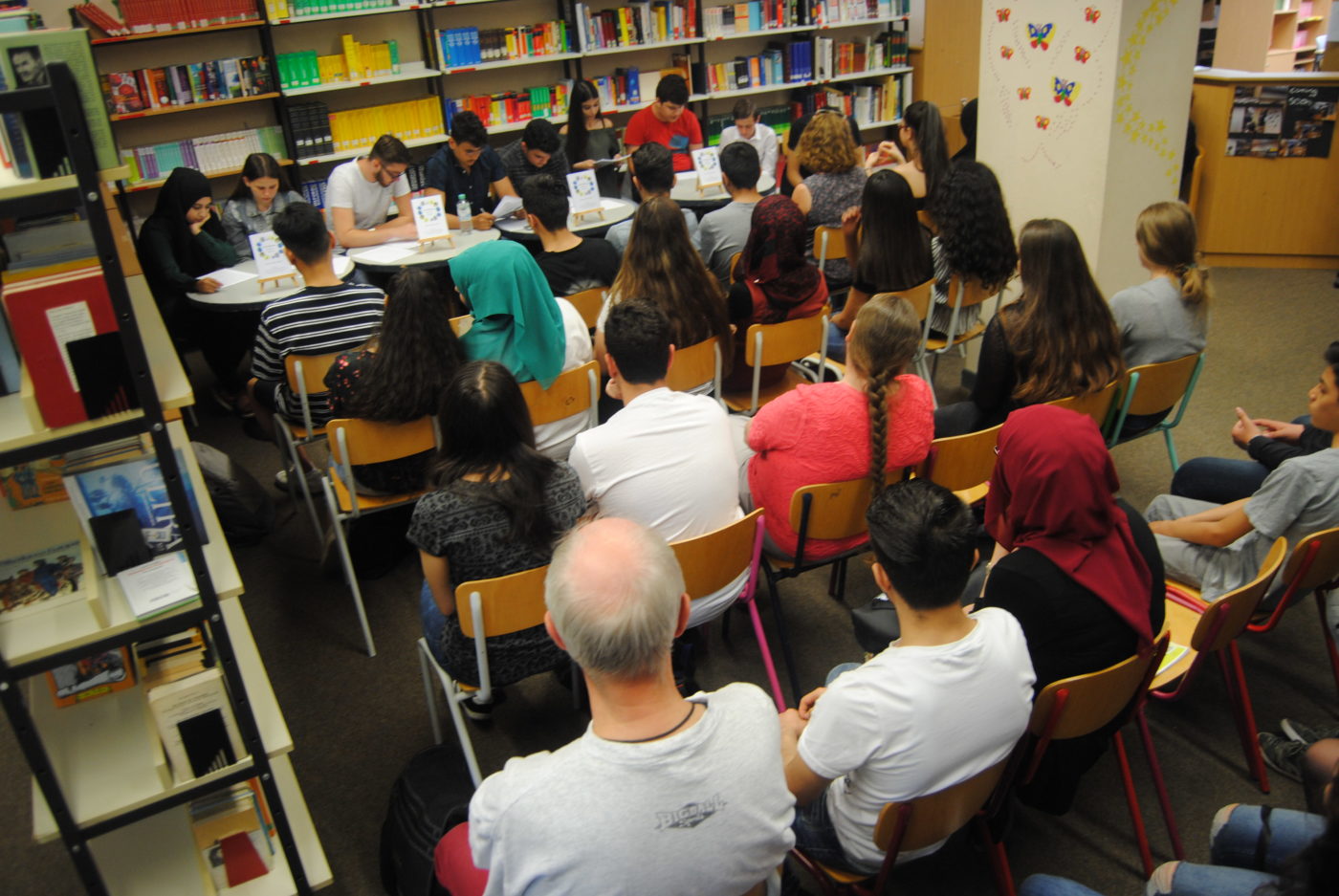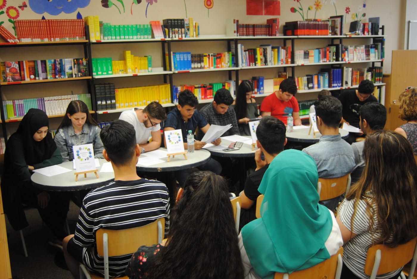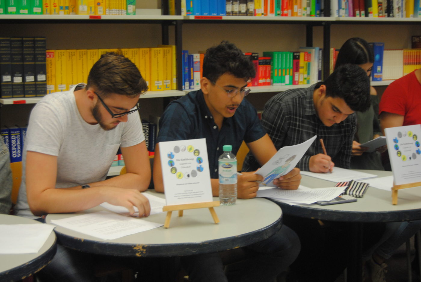 So beginnt der Roman „Die Entführung – Legende von Ückendorf“ aus der Schreibwerkstatt des 9. Jahrgangs, der am 3. Juli 2018 einem interessierten Publikum vorgestellt wurde. Die 9 Autorinnen und Autoren moderierten selbst die Vorstellung des Buches, gaben einen Einblick in die Arbeit des einjährigen Workshops und lasen Ausschnitte aus dem 200 Seiten umfassenden Roman.