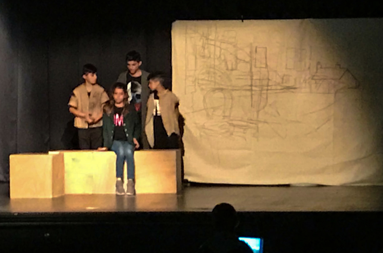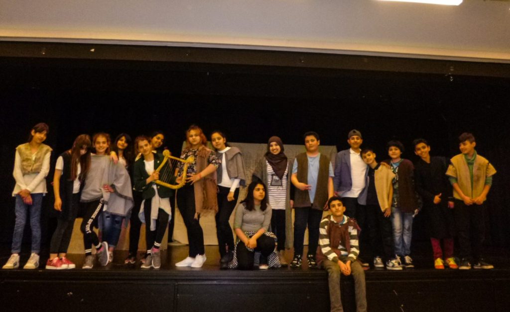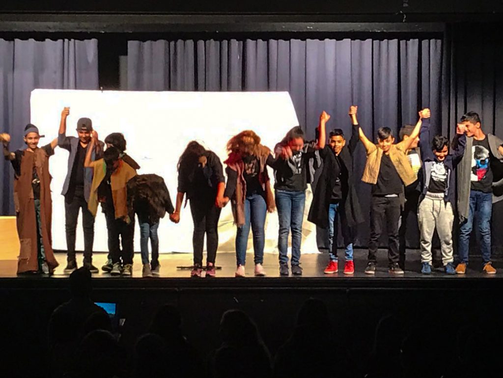 Nach monatelangen Vorbereitungen war es am 24. Mai so weit: die Schülerinnen und Schüler der Internationalen Förderklasse IFÖ-B1 präsentierten auf dem Darstellen-und-Gestalten-Tag in der Aula unserer Schule das musikalische Theaterstück „Die geschenkte Harfe“. Gemeinsam mit der Theaterpädagogin Katja Fischer vom Musiktheater im Revier und dem Ückendorfer D&G-Lehrer Klaus Wissing lernten die 19 Schülerinnen und Schüler aus sieben Nationen seit Beginn des Schuljahres ihre Texte und versuchten sich an der Schauspielerei.
