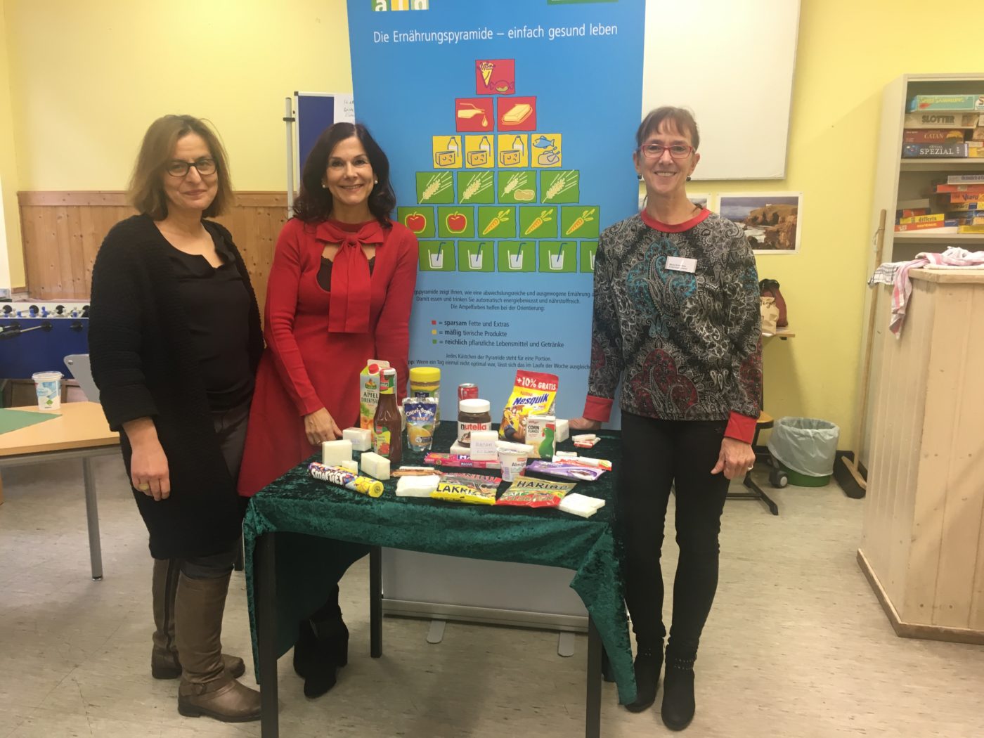 Die Exponate veranschaulichten sehr eindrucksvoll wie viel Fett und Zucker sich in den jeweiligen Nahrungsmitteln verbirgt. Die Zuckermenge wurde in Form von sichtbaren Zuckerstücken neben das jeweilige Lebensmittelexponat gelegt. Zu Beginn der Veranstaltung startete die Referentin mit der Zubereitung eines gesunden Müslis, das gemeinsam mit den Eltern zubereitet und verkostet wurde. Auch Väter machten bei der Zubereitung mit und beteiligten sich lebhaft an der Diskussion. Die Ernährungspyramide veranschaulichte exemplarisch wie man sich gesund ernährt.