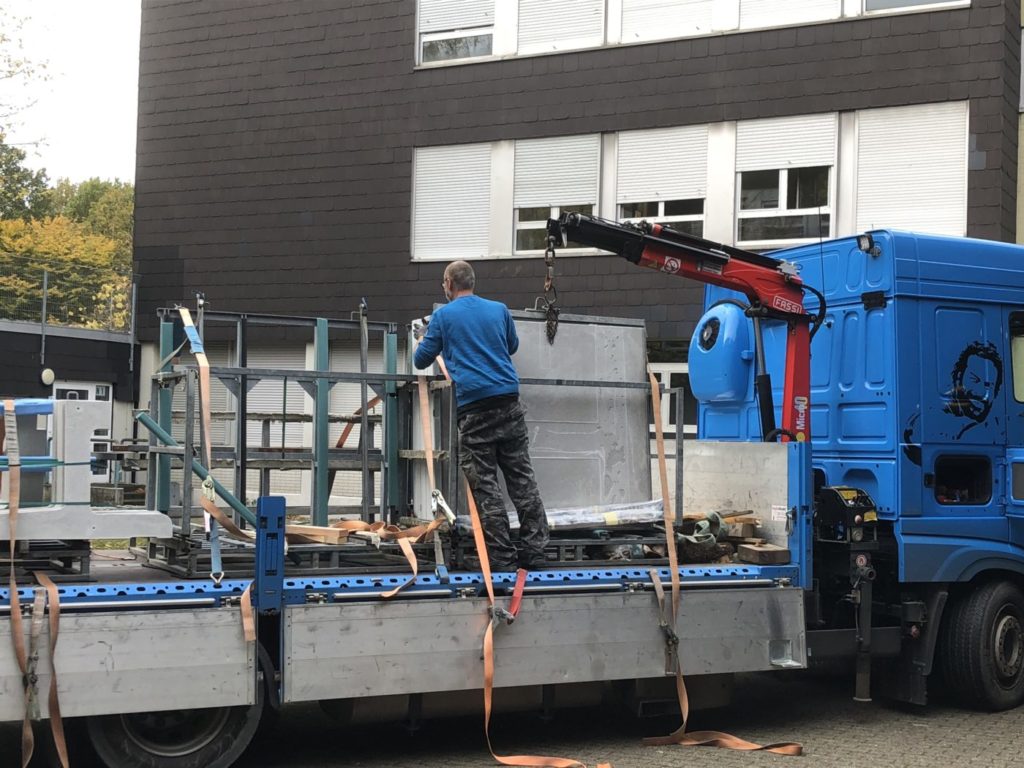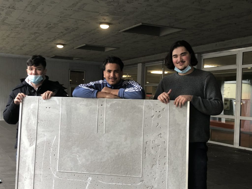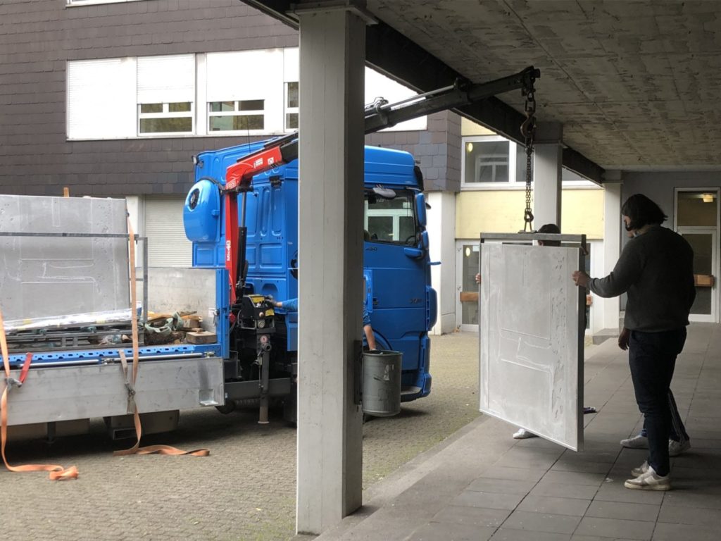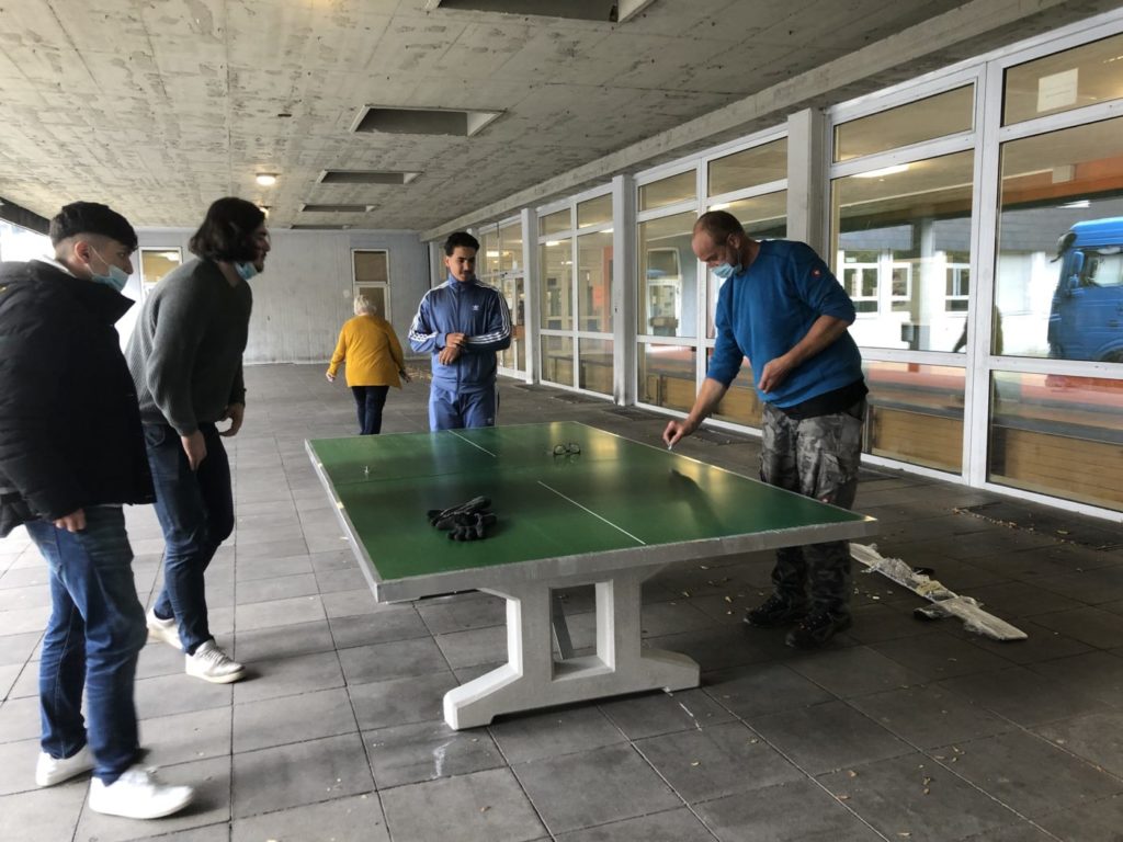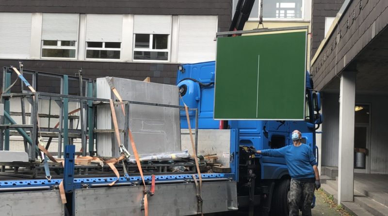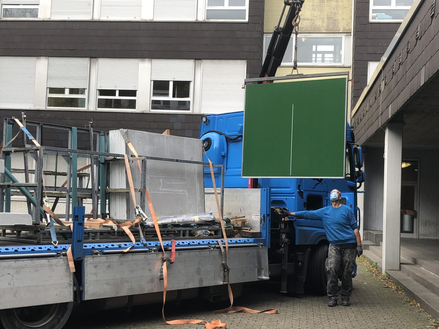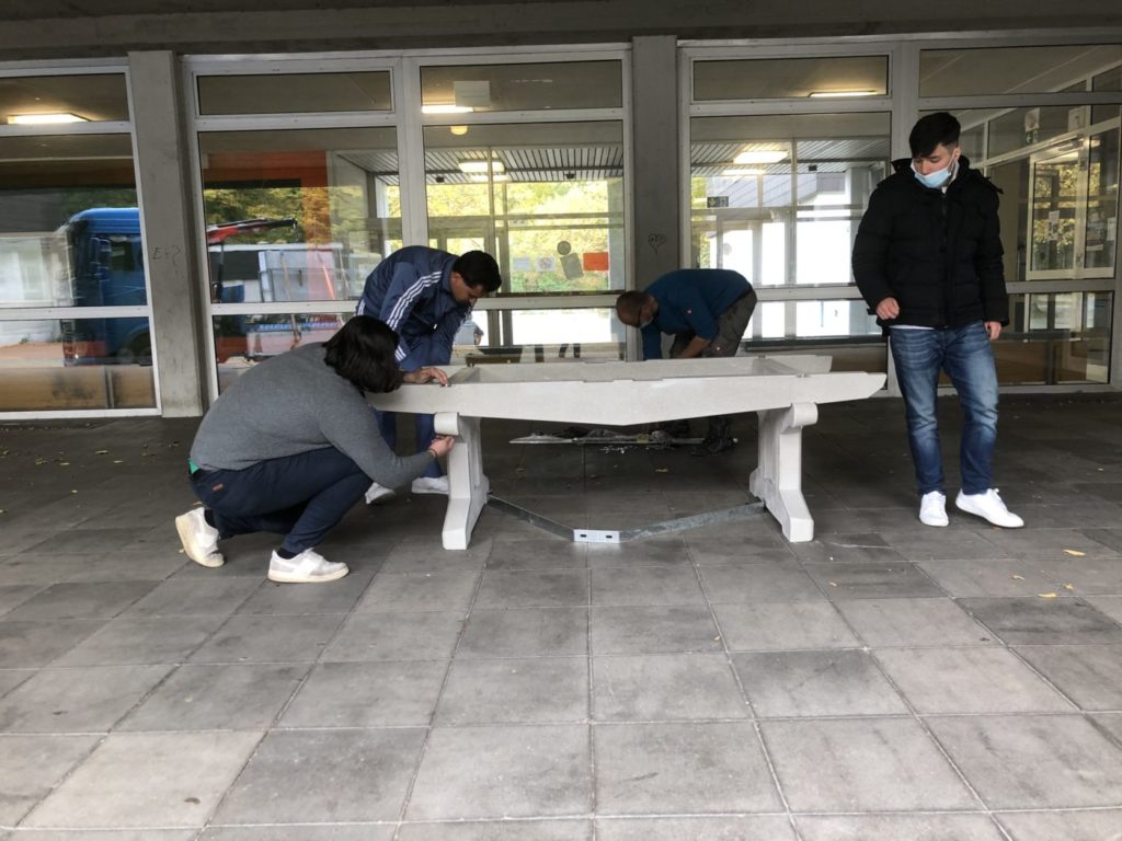 Direkt nach den Herbstferien, am 25. Oktober 2021, um 15.00 Uhr war es soweit: der riesige blaue LKW der Speditionsfirma Maillith mit dem Bud-Spencer-Logo auf dem Führerhaus bog auf den Schulhof ein, die schon vor den Sommerferien bestellte zusätzliche Tischtennisplatte für den Außenbereich unserer Schule rollte an. Was für ein Glück, dass wir so hilfsbereite Schüler*innen an unserer Schule haben: trotz der Kurzfristigkeit erklärten sich Omarabdalaziz Khasaba, Bilal Yalcin und Karahan Güngör spontan bereit, mit anzupacken und die schwere Polymerbetonplatte sowohl mit abzuladen als auch mit aufzubauen.