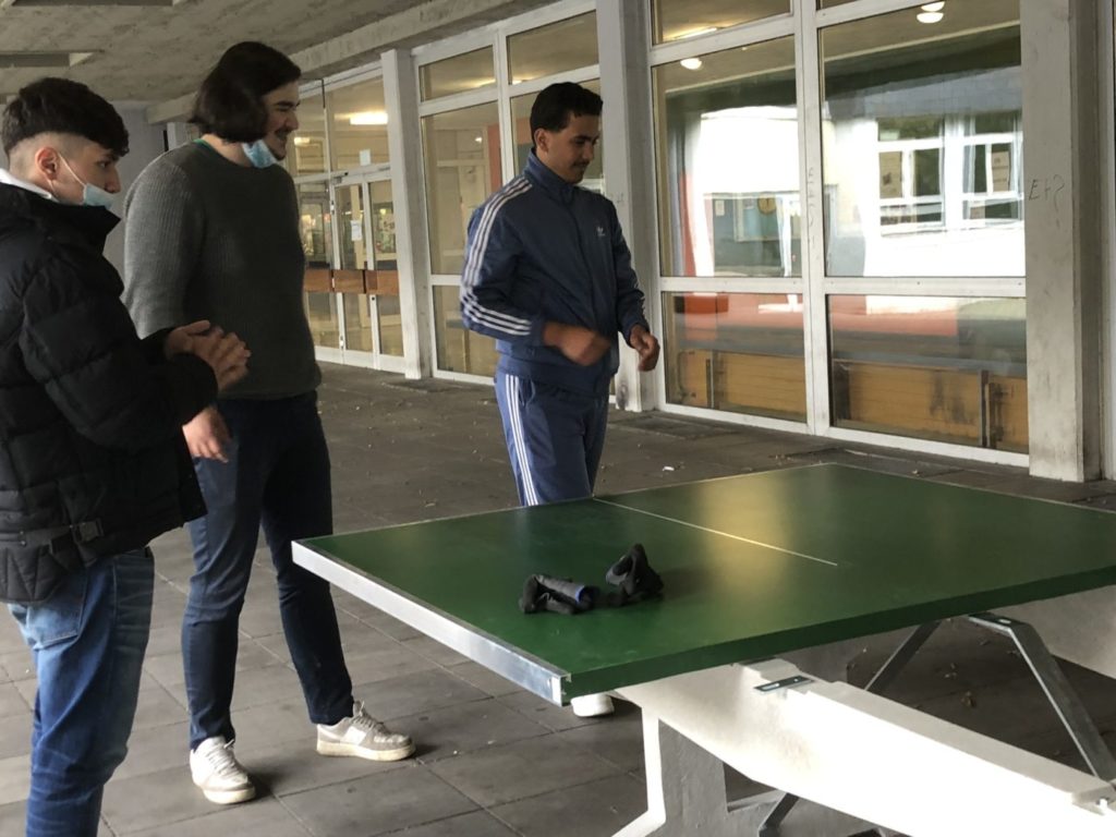 Nun steht das gute Stück und wird schon eifrig von Schüler*innen bespielt, allerdings meist mit einem Fußball als Spielgerät. Dabei kann man doch im Spielehaus gegen Vorlage des Schülerausweises problemlos Tischtennisschläger und –bälle in den Pausen ausleihen! Und sollten es irgendwann zu wenige werden: der Förderverein könnte problemlos für Nachschub sorgen.