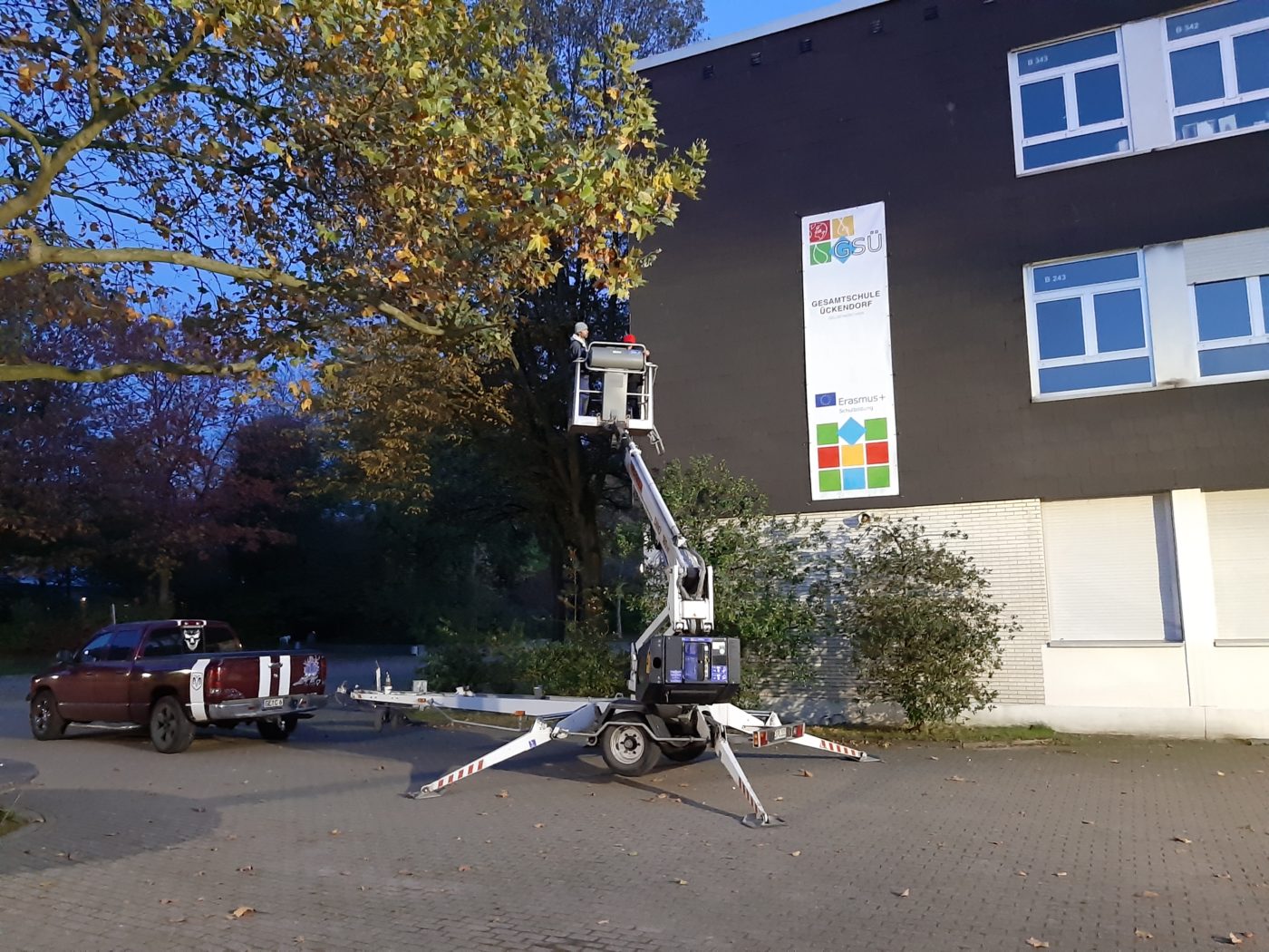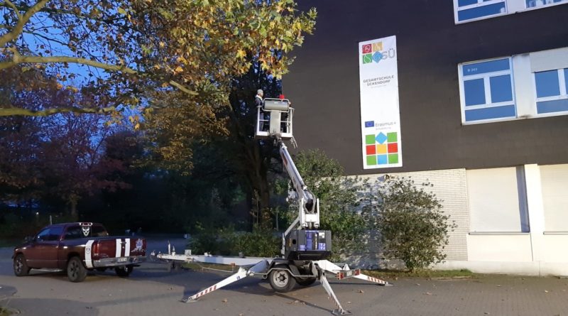 Damit man auch schon von außen sehen kann, dass wir eine aktive Erasmus+-Schule sind, wurde heute mit Unterstützung der Firma Porwol ein neues Banner Im Eingangsbereich der Schule angebracht. Es ist auch schon die erste Werbung für die internationalen Erasmustreffen, die im März an der GSÜ stattfinden werden.