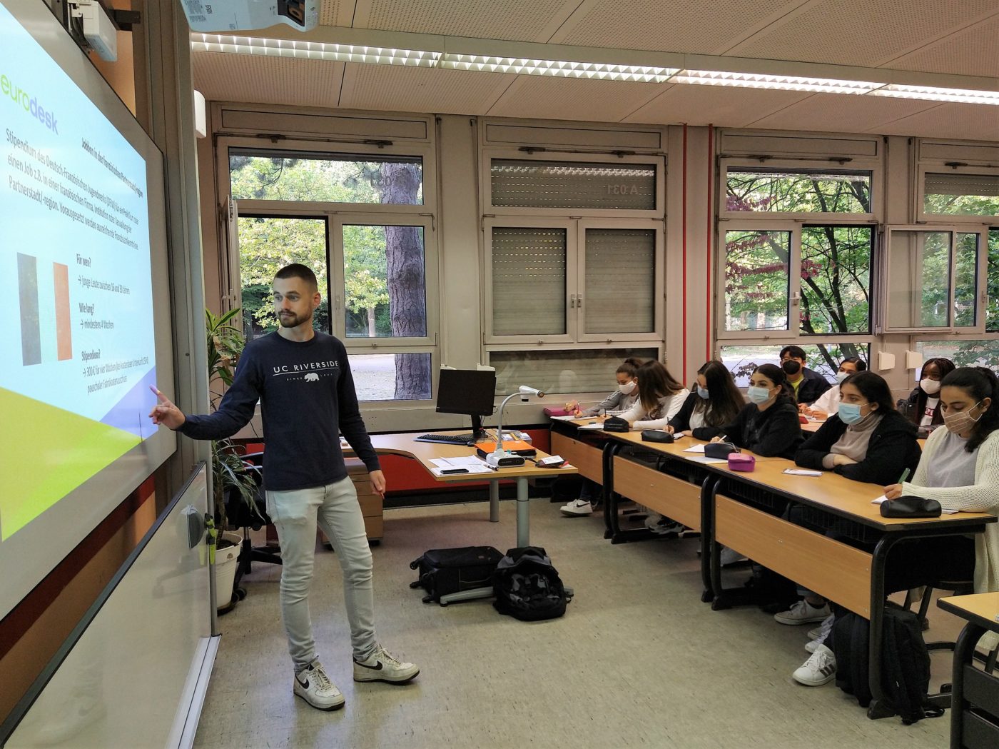 Die Schüler*innen entwickeln und verbessern dabei ihre Kompetenzen im Bereich der digitalen interkulturellen Kommunikation und der Sprachmittlung. Darüber hinaus stehen der europäische Gedanke und die Verwendung des Englischen als Verkehrssprache im Vordergrund. Am Donnerstag, den 17.09.2020 fand während des Unterrichts eine kleine Infoveranstaltung des aktuellen Forums Gelsenkirchen/Eurodesk statt. Felix Tschuch, ein Mitarbeiter des aktuellen Forums, informierte den Kurs auf Deutsch zu Auslandsaufenthalten und individuellen Wegen ins Ausland.
