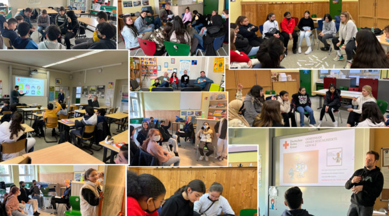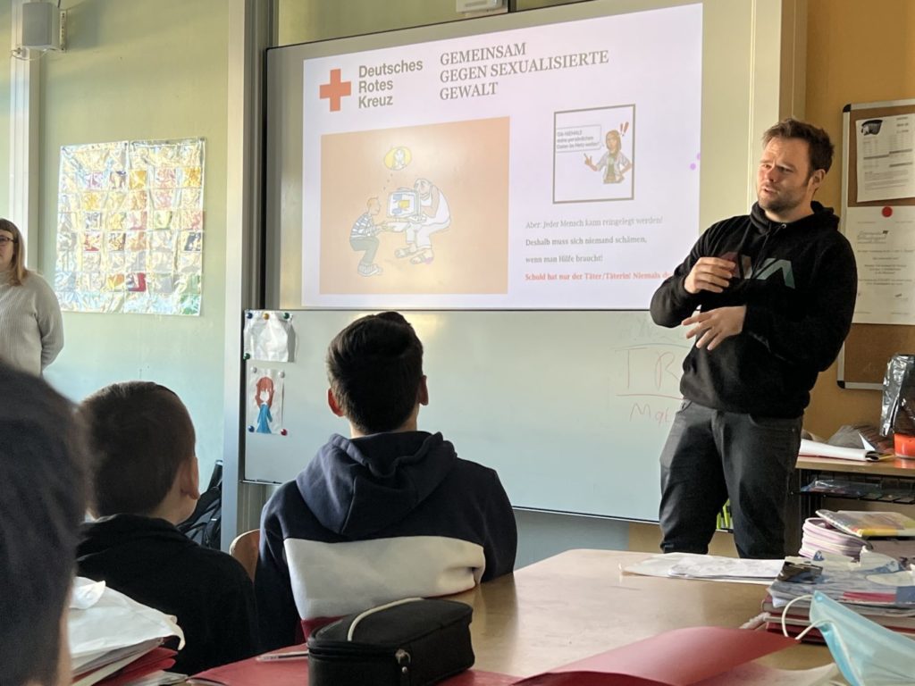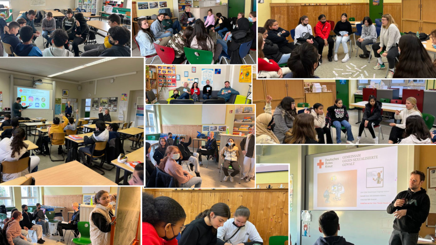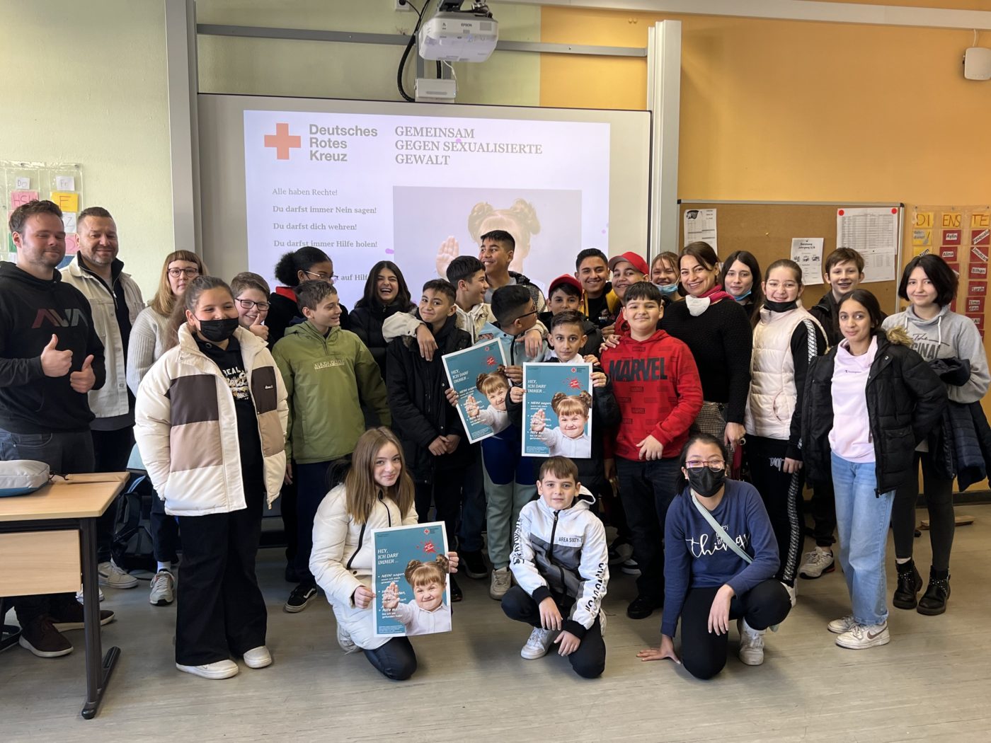 Aber auch alle Klassenlehrer*innen des gesamten sechsten Jahrgangs zeigten engagiert Flagge gegen sexualisierte Gewalt. An die Gruppenarbeit mit den Schüler*innen schlossen sich nämlich Reflexionsgespräche in Form einer intensiven Nachbesprechung mit den jeweiligen Klassenleitungen und dem Team des DRK an. Hierbei wurden den Klassenleitungen auch Möglichkeiten und Hilfen an die Hand gegeben, die begonnene Arbeit in der eigenen Klasse weiter zu führen und zu verstetigen.