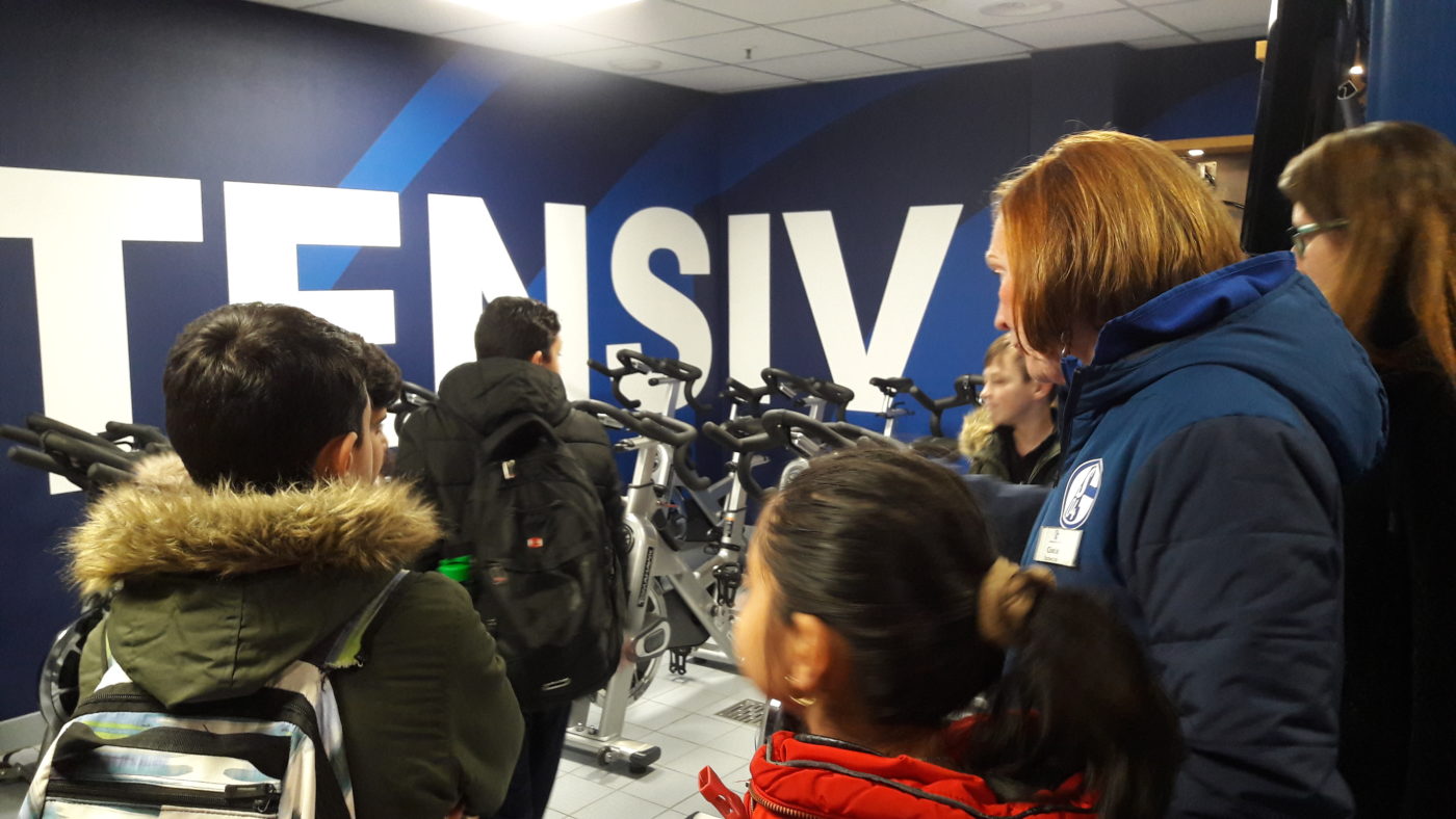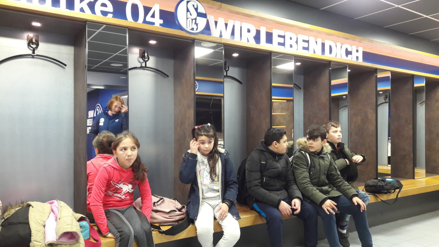 Dann nahm Gisela die Klasse mit für einen Rundgang durch die Arena. Der Weg führte über das Schalke-Museum durch die Spielerkabine zum Spielfeld. In der Kabine durften sich die Schüler auf die Plätze der Bundesligaspieler setzen. Weitere Orte, die besucht wurden, die Knappen-Kapelle, in der getauft und geheiratet werden kann. Die Physio-Abteilung bestand unter anderem aus einem Park von Fahrrädern, einem Eisbecken und Warmwasserbecken.