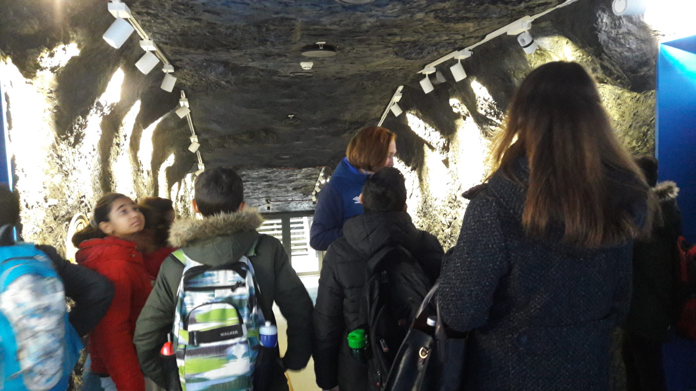 Der Spielertunnel, ein Gang, der mit Kohle an den Wänden verkleidet war, führte zum Spielfeld, der eigentlichen Arena. In der Arena angekommen, hatten die Schüler Glück, denn sie konnten einige Schritte auf das grüne Spielfeld wagen. Der Rasen wird sonst nämlich außerhalb der Arena aufbewahrt und nur für die Fußballspiele in die Arena eingefahren. Das Einfahren des Rasens, in die Arena, dauert bis zu 4 Stunden.