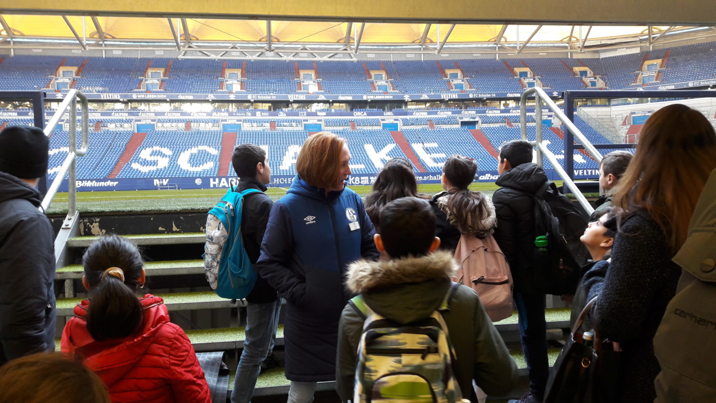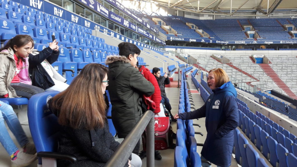 „Glück auf“ so begrüßte Gisela, die Mitarbeiterin der Schalke-Arena, die IFÖ A1 der Gesamtschule Ückendorf. Die Begrüßung mit „Glück auf“ hängt mit der engen Verbindung des Vereins und dem Bergbau zusammen. So auch die Bezeichnung der Spieler als Knappen, denn so nannte man früher unter Tage die Bergleute.