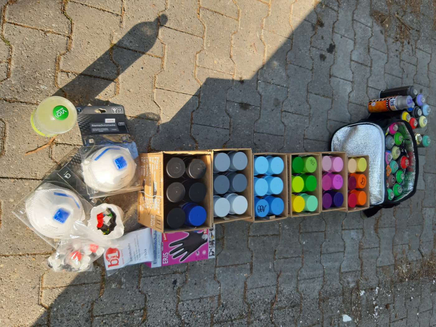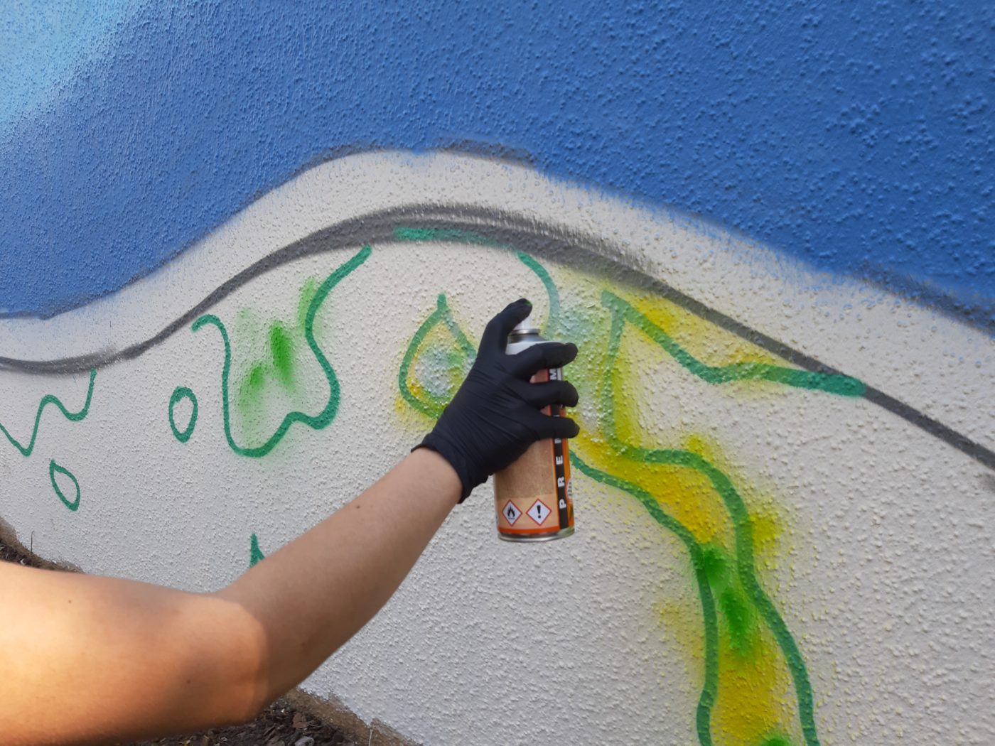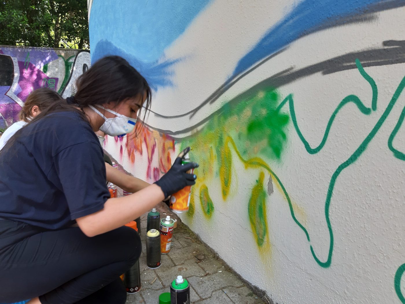 So meldete Frau Buyruk die Schülerinnen für Sonntag (ja, am Wochenende in ihrer Freizeit!) den 26. Mai 2019 zu dem Workshop „Richtig sprayen will gelernt sein“ bei der Street Art Initiative der Falken Gelsenkirchen im Ückendorfer Spunk an. Dort lernten sie auch den Graffiti-Künstler Fabian Schlott kennen, mit dessen Unterstützung dann das Projekt vom 25. – 27. Juni durchgeführt wurde.