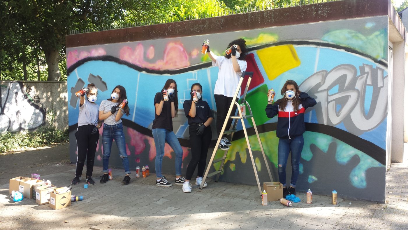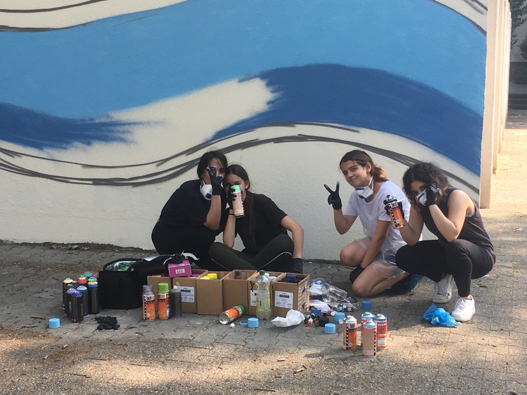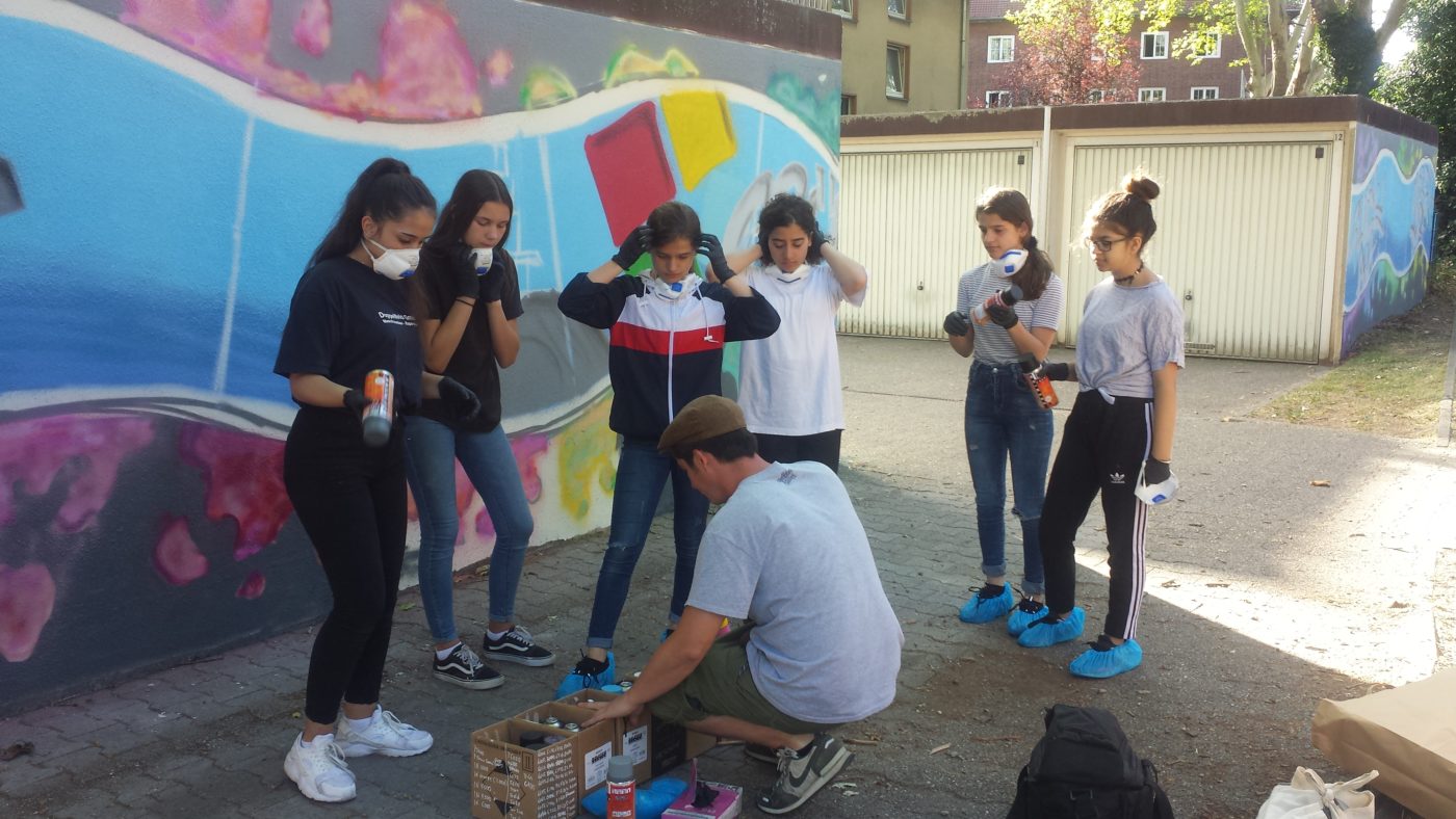 Gesagt – getan! Das Projekt wurde zunächst grundsätzlich in der Schulleitung als wünschenswert beurteilt und eine engagierte Lehrkraft gesucht, die ein solches Projekt übernehmen könnte und wollte. Zum Glück zögerte Nermin Buyruk, eine unserer Kunstlehrkräfte, nicht lange und sagte zu. Sie machte sich auf die Suche nach interessierten Schülerinnen und Schülern. Nach den Osterferien stand die Besetzung fest: die Schülerinnen Dafina, Albina, Jil, Fatime, Heba sowie Flora aus der Klasse 7/3 stürzten sich in die Arbeit und sammelten erste Ideen. Schnell wurde klar: Ideen hatten die Mädels genügend, aber eine professionelle Unterstützung bei der Umsetzung in Graffitis wäre schon hilfreich.