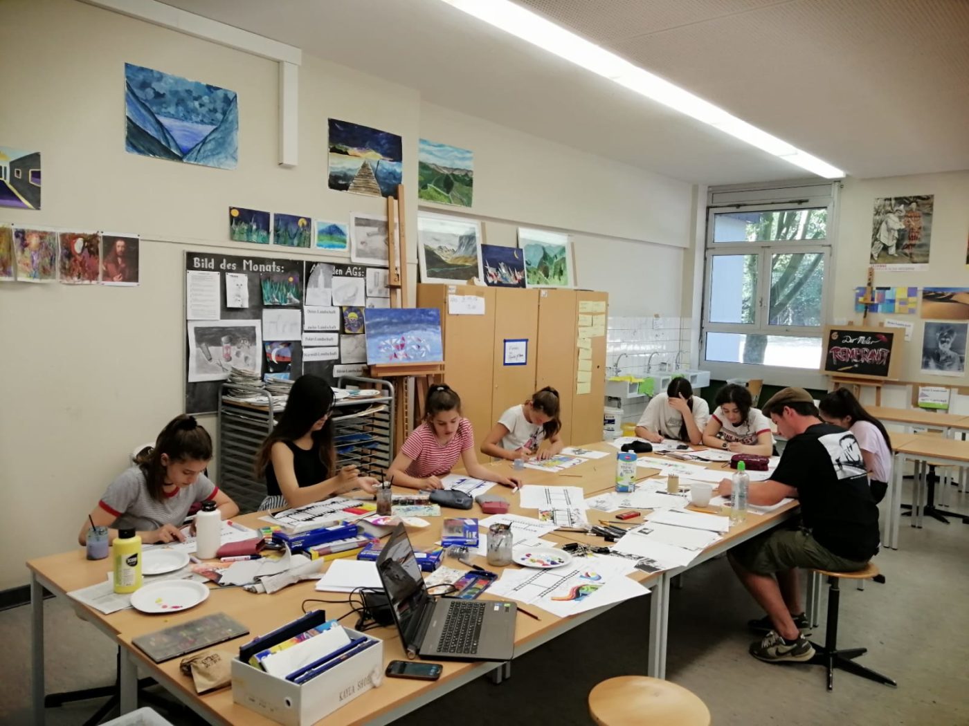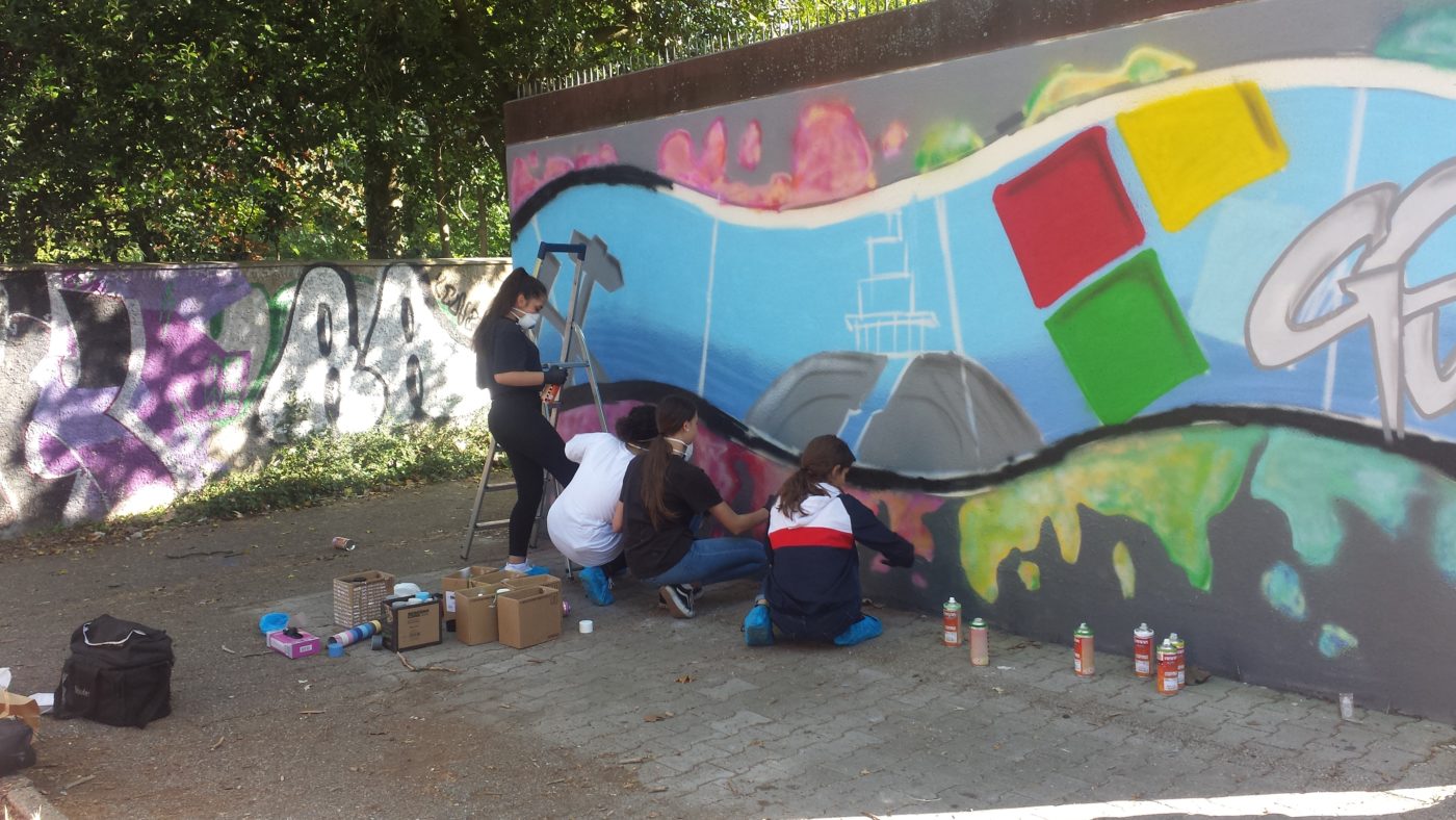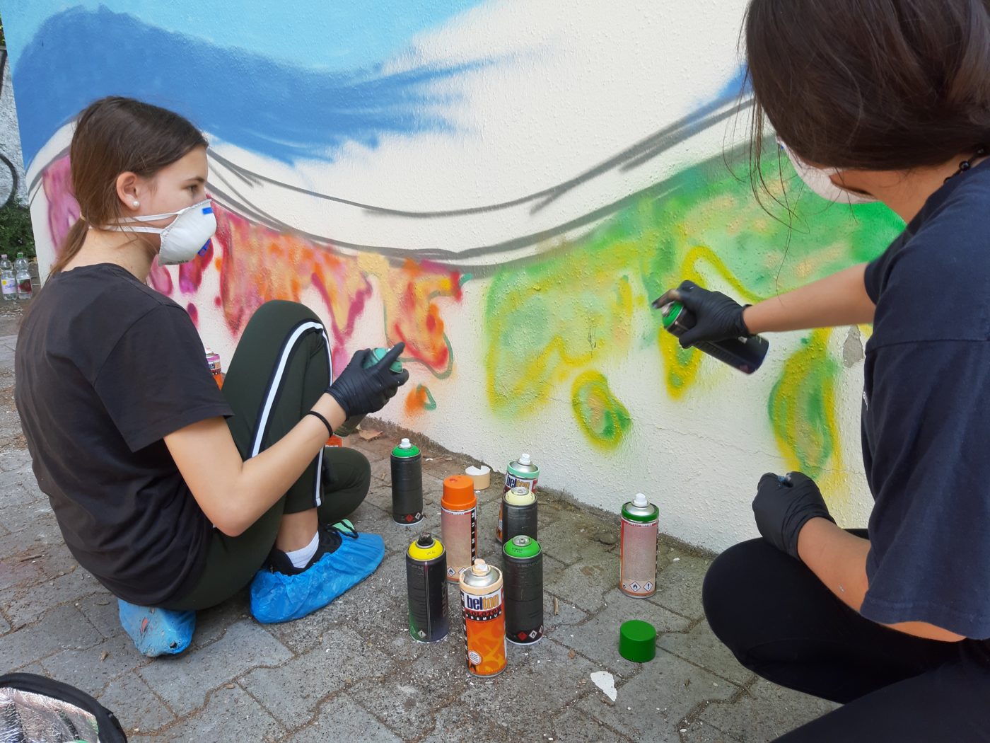 Gesagt – getan! Das Projekt wurde zunächst grundsätzlich in der Schulleitung als wünschenswert beurteilt und eine engagierte Lehrkraft gesucht, die ein solches Projekt übernehmen könnte und wollte. Zum Glück zögerte Nermin Buyruk, eine unserer Kunstlehrkräfte, nicht lange und sagte zu. Sie machte sich auf die Suche nach interessierten Schülerinnen und Schülern. Nach den Osterferien stand die Besetzung fest: die Schülerinnen Dafina, Albina, Jil, Fatime, Heba sowie Flora aus der Klasse 7/3 stürzten sich in die Arbeit und sammelten erste Ideen. Schnell wurde klar: Ideen hatten die Mädels genügend, aber eine professionelle Unterstützung bei der Umsetzung in Graffitis wäre schon hilfreich.
