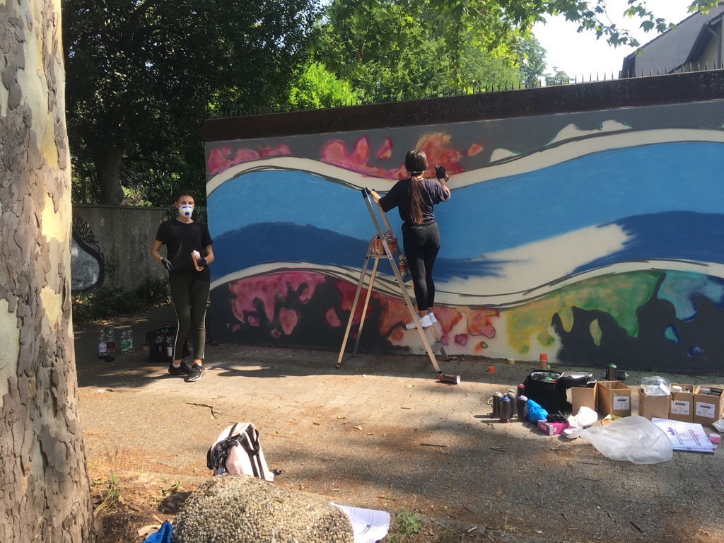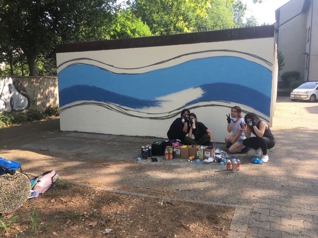 Zunächst wurden am Dienstag in der Schule die verschiedenen Entwürfe nochmals gesichtet und verbessert und die beiden Endfassungen für die zwei Wände der Vivawest zur Abnahme vorgelegt. Mittwoch und Donnerstag ließen sich dann die Künstlerinnen trotz der Temperaturen um die 33 Grad nicht von ihrer Arbeit abhalten: am 27. Juni gegen 11.30 Uhr waren die Wände fertig gestaltet. Passanten und Anwohner zeigten sich schwer beeindruckt von den Bildern!