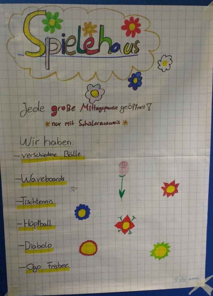 In jeder großen Mittagspause ist das Spielehaus geöffnet und wird von zwei BuddYs betreut. Sie verleihen im Austausch gegen den Schülerausweis alle möglichen Spielgeräte. Besonders beliebt sind dabei Fußbälle, Waveboards oder Tischtennisschläger und –bälle. Das Spielehaus hat allerdings noch weitaus mehr zu bieten: Stelzen, Frisbees, Diavolos, Drehteller und spannende Dinge wie ein Schwungtuch oder auch ein großes „Mensch ärgere dich nicht“ für den Schulhof.