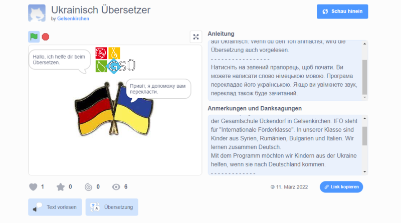 Das dabei entstandene Programm hat im Vergleich zum Google-Übersetzer sogar einige Vorteile: es werden keine Daten über die Nutzung gesammelt und die Vorlesegeschwindigkeit in ukrainischer Sprache ist deutlich höher und flüssiger als beim Anbieter aus Kalifornien. Das Angebot ist verbunden mit der Hoffnung, dass es bald nicht mehr nötig sein wird und wieder Frieden in Europa herrscht. Bis dahin können die Kinder der IFÖ-Klassen so zumindest einen kleinen Beitrag leisten. Denn wie sagte bereits Theodor Fontane: „Das Menschlichste, was wir haben, ist doch die Sprache.“