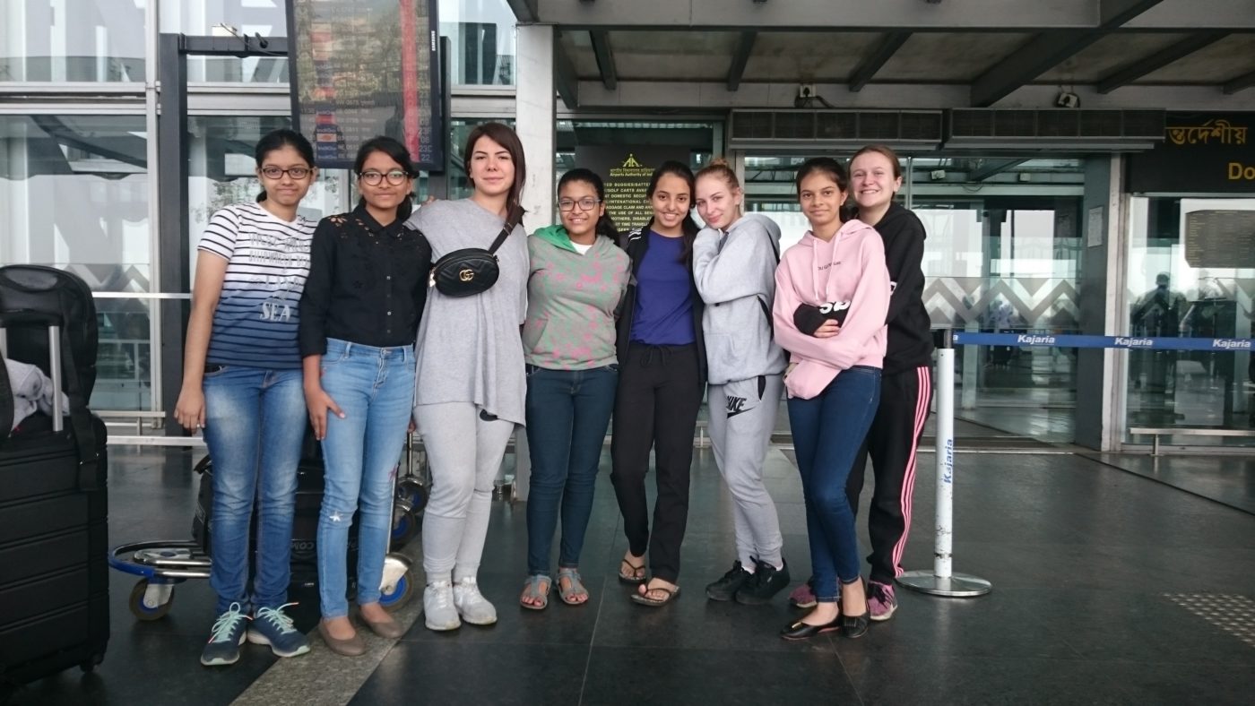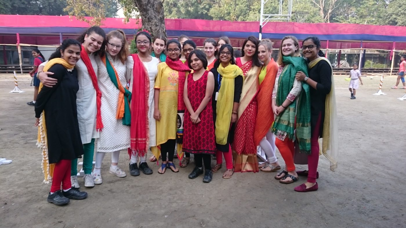 Doch nicht nur mit den Spielen auf dem Schulhof beteiligten sich die Austauschschülerinnen am Programm des „Treffpunkt“. Auch am Hauptprogramm in der Halle der Schule nahmen die Schülerinnen mit einem besonderen Tanz teil, der seit dem Wochenende eingeübt worden war. Auf der Bühne erschienen die indischen Schülerinnen in schwarz-rot-gelber Kleidung, die deutschen Schülerinnen trugen die Farben der indischen Flagge, orange, weiß und grün.