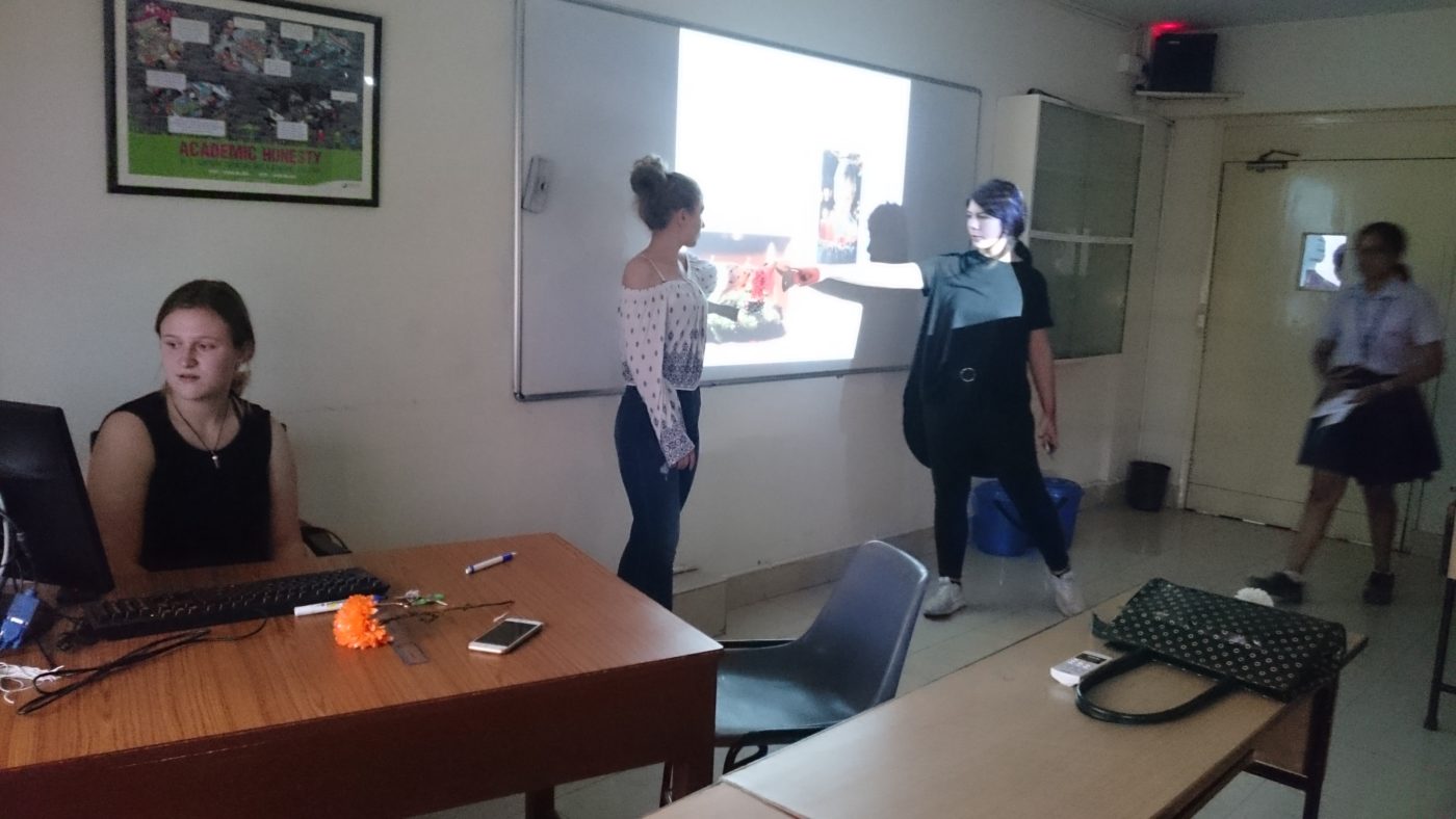 Am Donnerstag, dem letzten Tag des Austauschprogramms, gab es noch eine besondere Aufgabe für die deutschen Schülerinnen. An der South City International School sollten sie ganz neuen Deutschschülern das traditionelle Weihnachtsfest in Deutschland näher bringen. Am Vormittag übte man noch an der Präsentation in einem Klassenraum, am Nachmittag in der Schule stellten wir fest, dass man die Aula extra für uns vorbereitet hatte. Spontan mussten sich alle etwas umstellen, auch das Singen über die Mikrofone war für viele ungewohnt. Aber nach einer halben Stunde waren die Schüler der South City International School begeistert von Weihnachten an sich und insbesondere von deutschen Weihnachtsliedern.