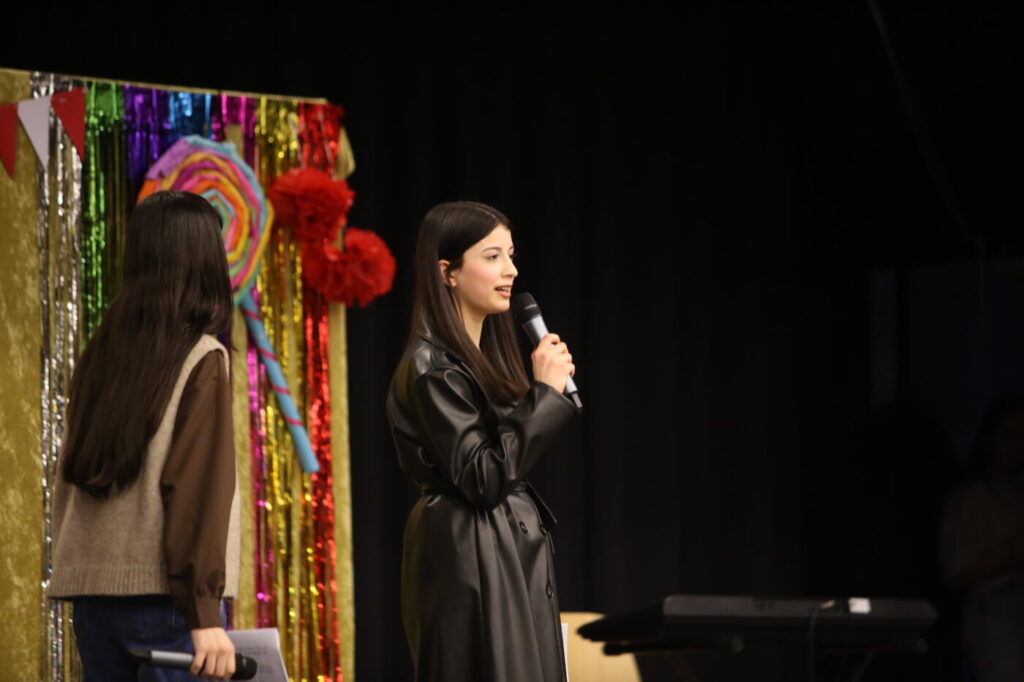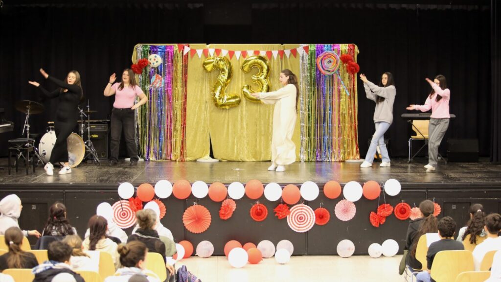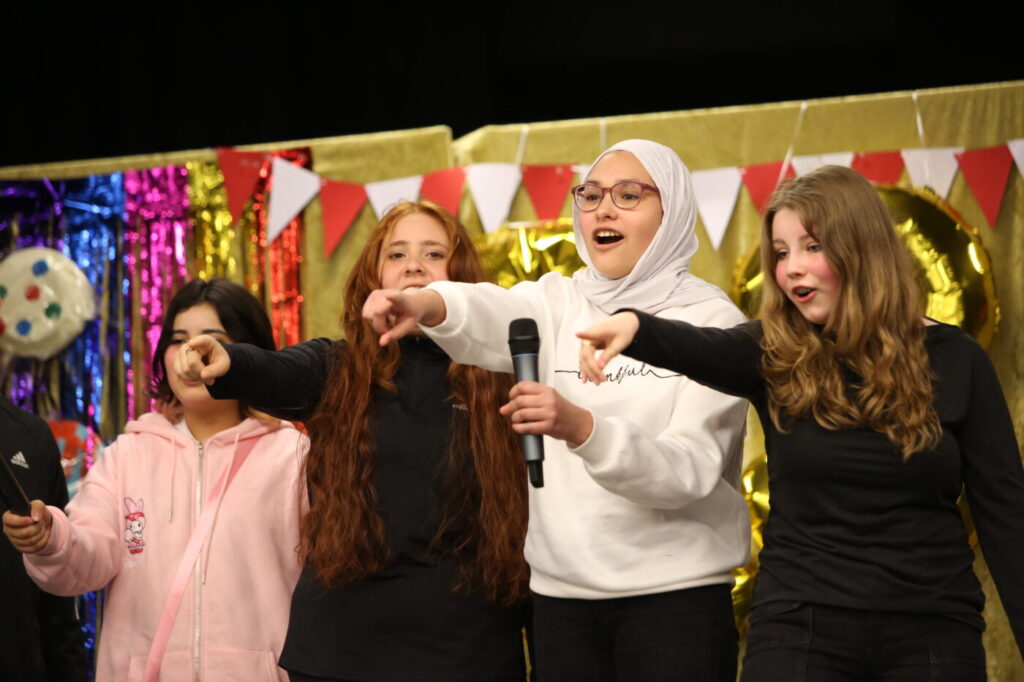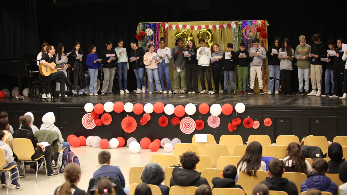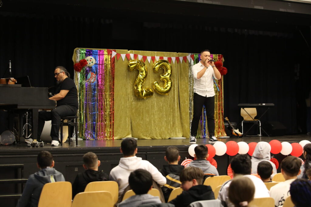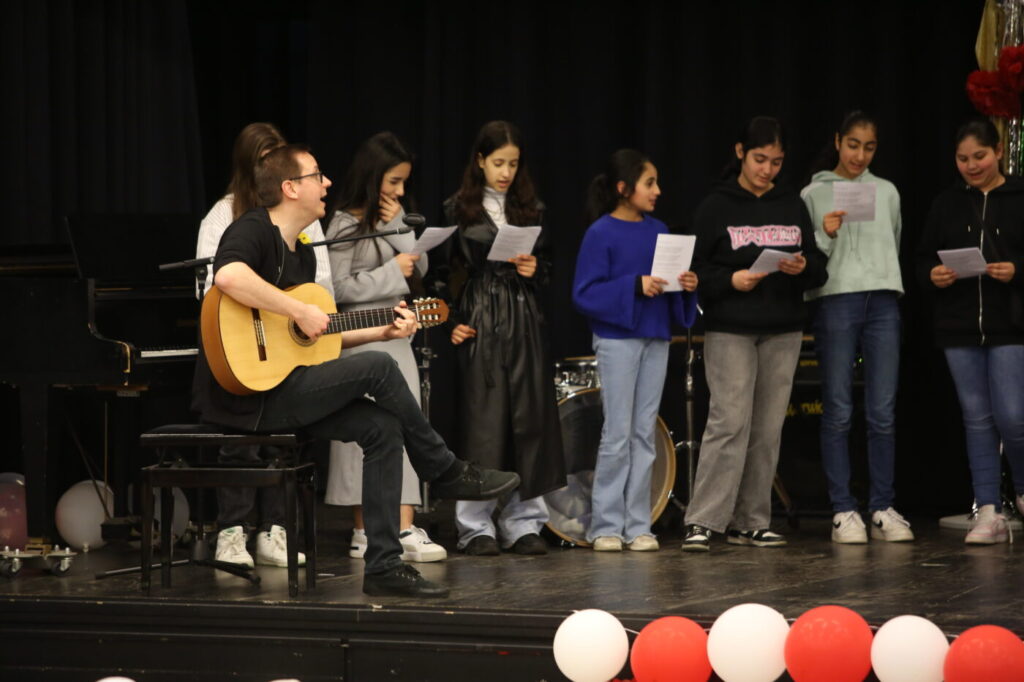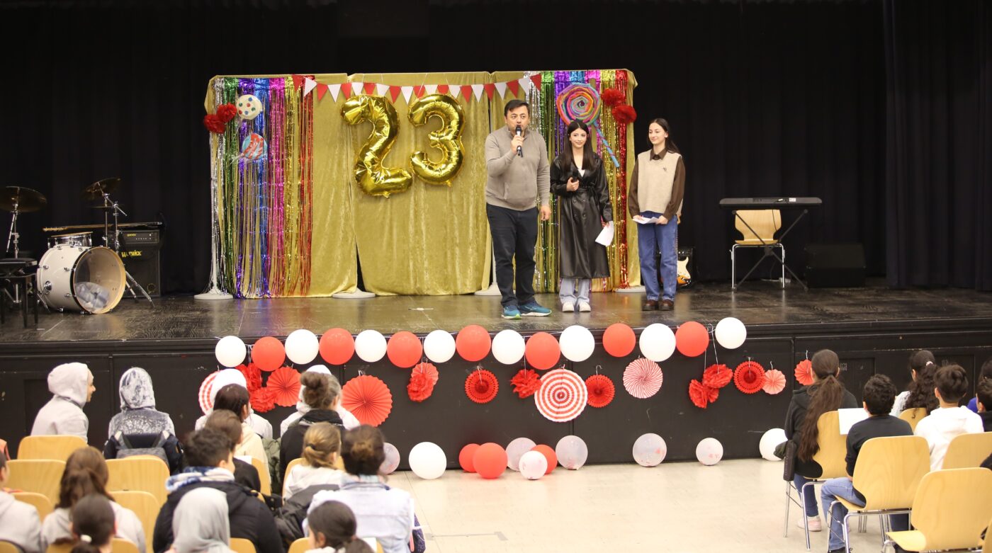 Die Veranstaltung startete mit Begrüßungen in den vielen Sprachen, die in unserer multilingualen Schule gesprochen werden. Nach einem Beitrag zur Geschichte des Tages des Kindes gab es neben den tänzerischen Darbietungen der Tanz-AG, Gesangsdarbietungen verschiedener Klassen und des Schulbands. Zudem wurde das Programm durch verschiedene interaktive Darbietungen des Spanischkurses auf dem 7. Jahrgang bereichert. Einem besonderen Applaus gab es für Abbas aus der EF, der sein selbst komponiertes Rap-Song „Bitter“ präsentierte und für Leonita (6.5.), die auf dem Klavier ein Lied vorspielte. Zum Abschluss überraschten Herr Altun und Herr Karabacakoglu das Publikum mit einem Mini-Konzert.