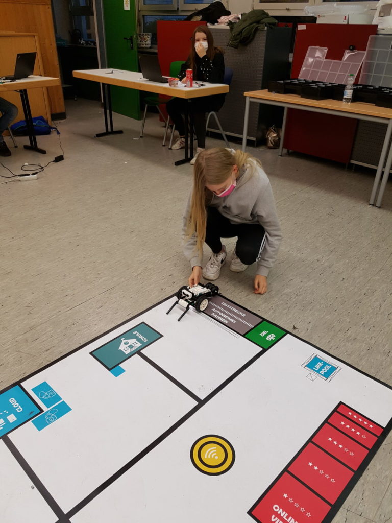Sowohl die zahlreichen Neuzugänge der Roboter-AG als auch die „alten Hasen“ haben dabei in zwei Tagen sehr viel geschafft. Dabei entdeckten die SchülerInnen auch neue Funktionen: indem sie die Pixel des Displays einzeln ansteuerten, konnte einer der Roboter Botschaften überbringen und sogar einen aus Lego gebauten Ring überbringen. So flitzten zwischendurch immer wieder Roboter herum, mit denen die Konstrukteure frei nach Nat King Colde Nettigkeiten austauschen konnten: „The greatest thing to ever learn is to love and be loved in return.“ Am Ende des ersten Videos sieht man ein schönes Beispiel für diese neu entdeckte Funktion.