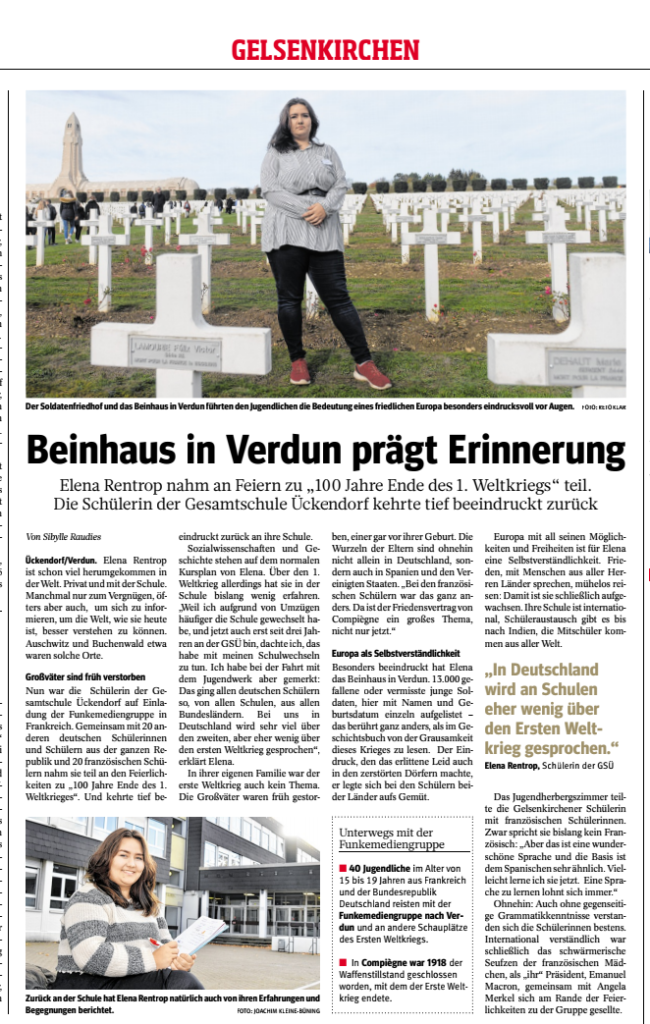 Als eine von 20 SchülerInnen aus Deutschland hat Elena Rentrop aus dem Jahrgang 13 an den deutsch-französischen Gedenkfeiern zum Ende des 1. Weltkriegs in Verdun teilgenommen. Die Fahrt war organisiert worden von der Funke Medien Gruppe, die unter anderem auch die WAZ herausgibt. Ein allgemeiner Bericht über die Begegnung der 20 deutschen und 20 französischen Schülerinnen und Schüler ist öffentlich lesbar (WAZ-Link). Im Lokalteil der WAZ ist am Dienstag ein Artikel über Elena erschienen, der nur für Abo-Plus-Kunden zu lesen ist. Er ist daher nur im internen Teil der Homepage als Screen-Shot zu sehen.