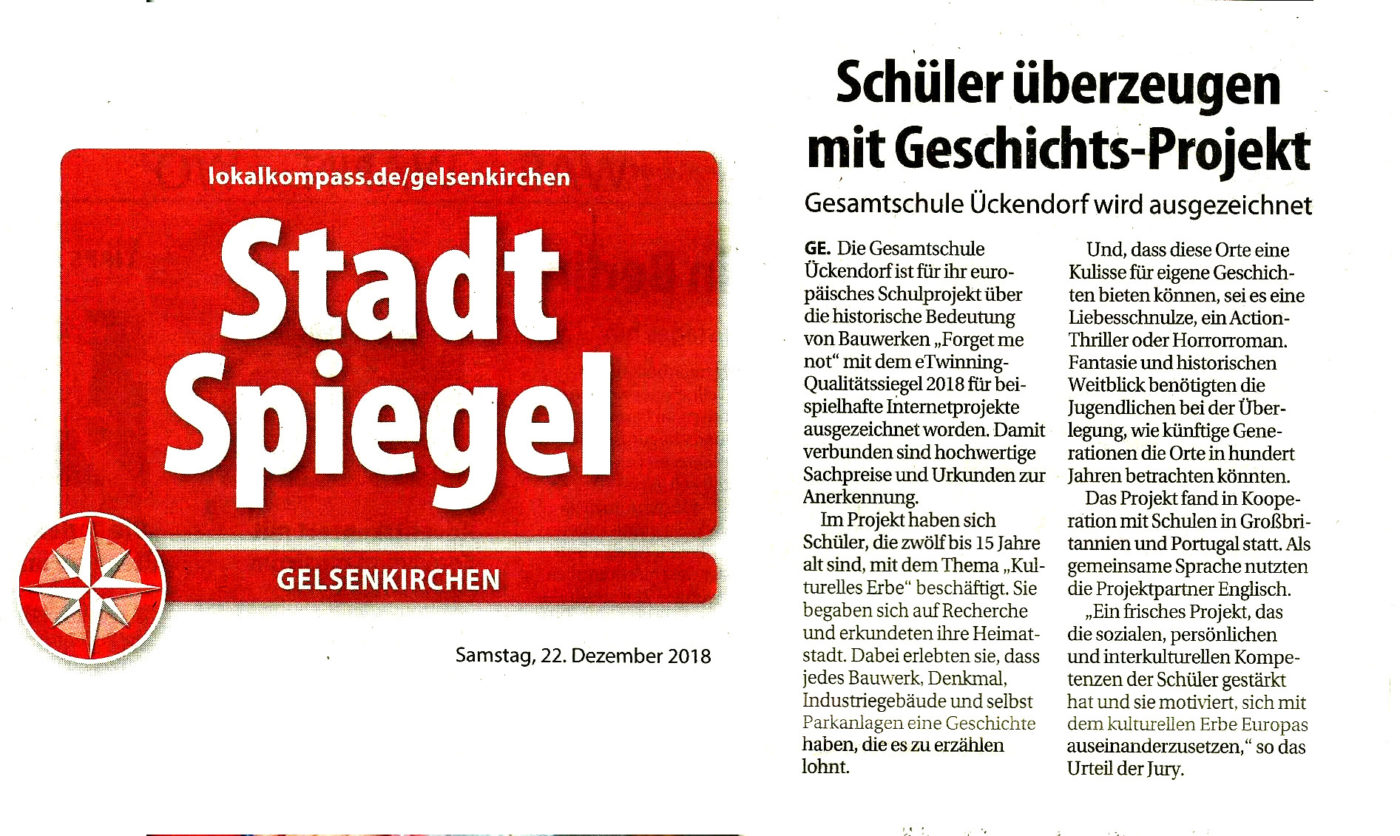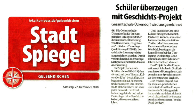 Der Stadtspiegel berichtet in seiner Ausgabe vom 22.12.2018 über unser eTwinning-Projekt „Forget me not„. Mit dem Preis der KMK ist das Projekt nun in allen drei beteiligten Ländern (Portugal, England und Deutschland) ausgezeichnet worden.