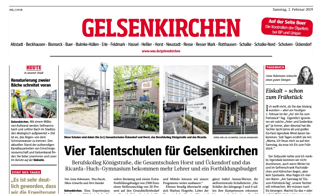 Die WAZ berichtet in ihrer Samstag-Ausgabe über die vier ausgewählten Talentschulen in Gelsenkirchen in ihrem Digital-Abo-Bereich.