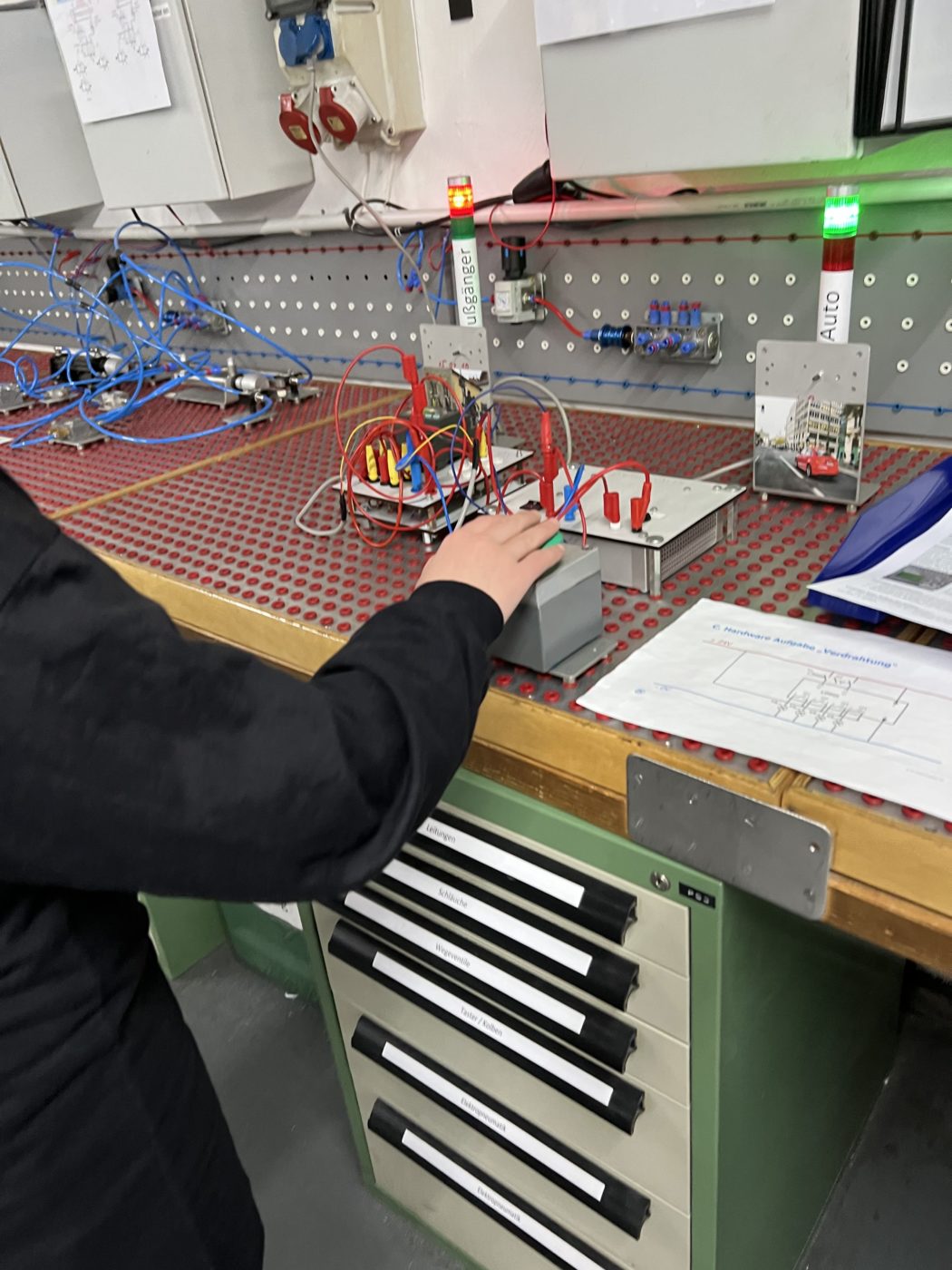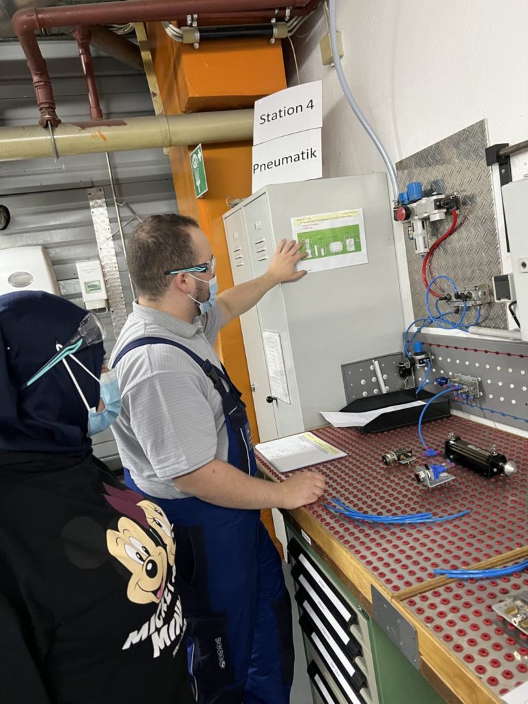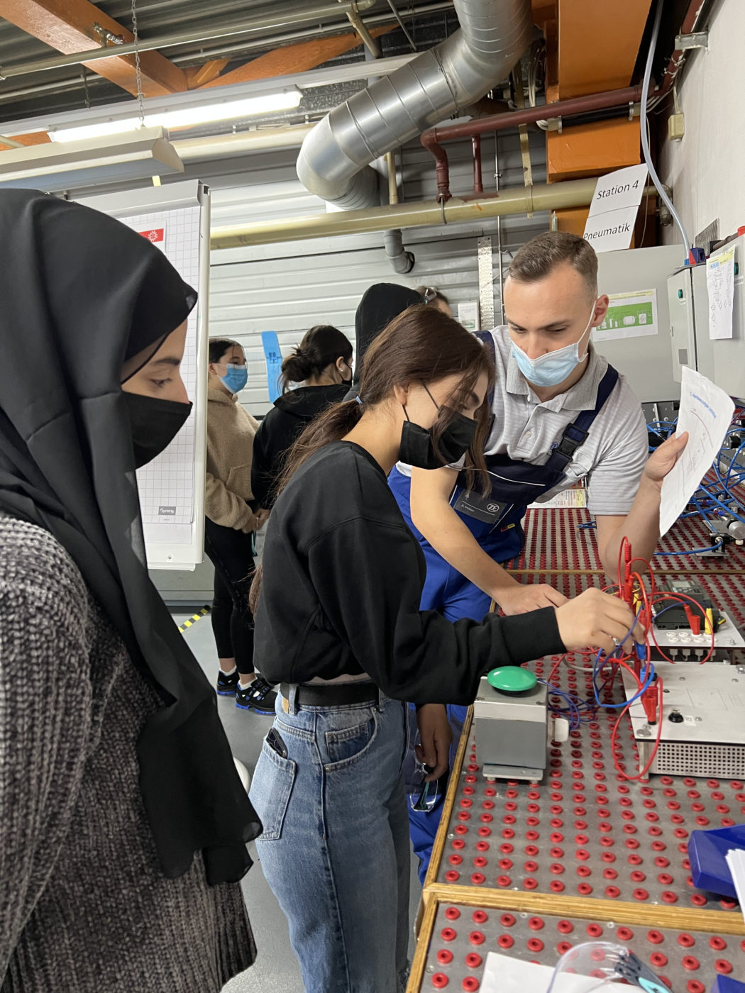Sie gaben Einweisung in die Funktion und das Bedienen verschiedener Maschinen. Die erste Station war dazu da, manuelle Fertigungsverfahren kennenzulernen und zu erproben. Die Mädchen lernten auch die Bedienung einer Fräse kennen, die mit höchster Präzision, Werkstücke in hoher Stückzahl und kürzester Zeit herstellen kann. Ein weiterer Bereich war die Pneumatik. Hier konnten die Mädchen pneumatische Steuerungen kennenlernen und selbst erproben. Die Funktion einer Drehmaschine wurde den Mädchen ebenfalls nahegebracht. Auch die Steuerung einer Ampelanlage konnte ausprobiert werden. Sie wurden auch an die Hardware Aufgabe der Verdrahtung herangeführt. Sie mussten Schaltpläne lesen lernen und danach korrekt verdrahten.