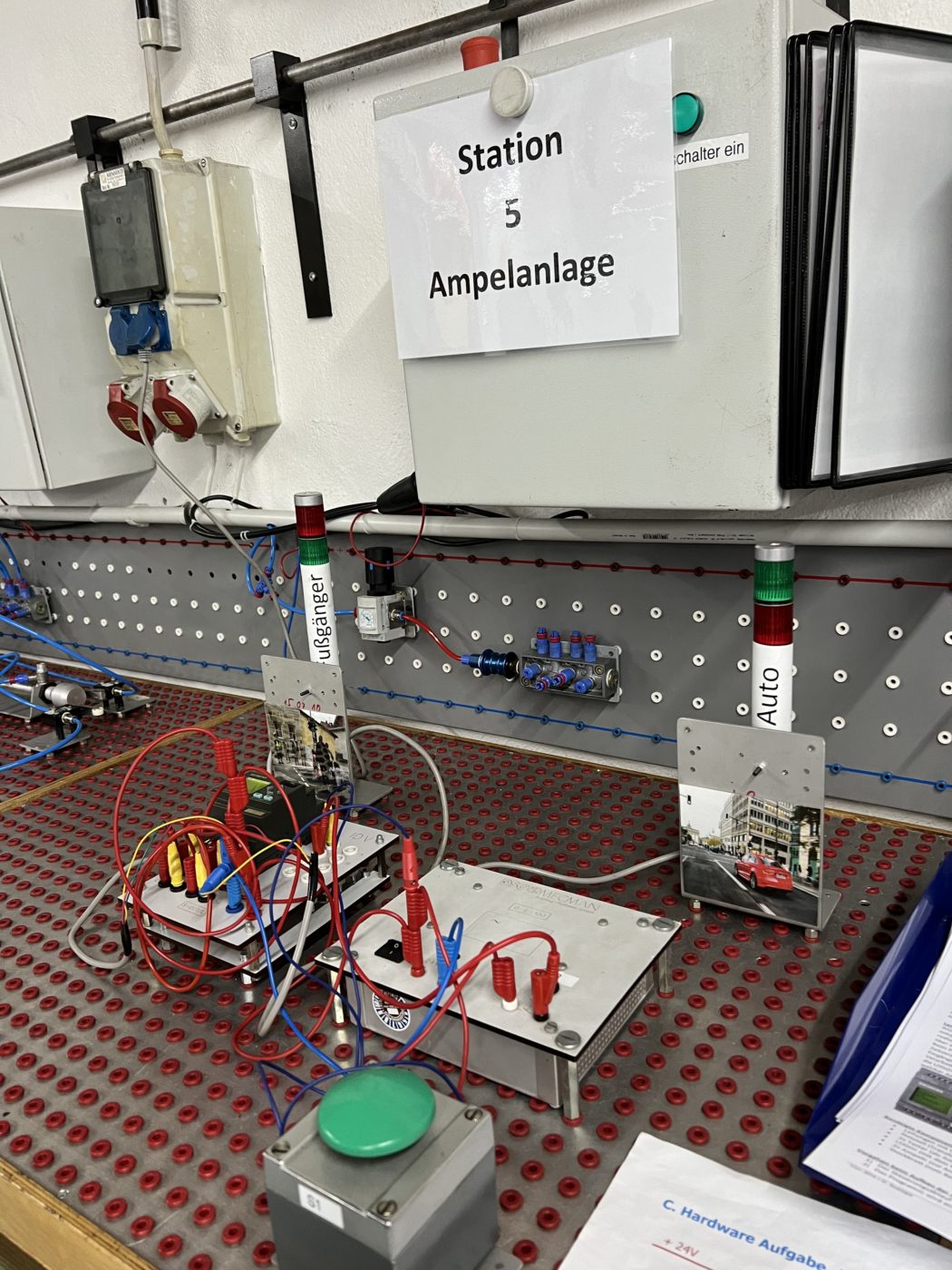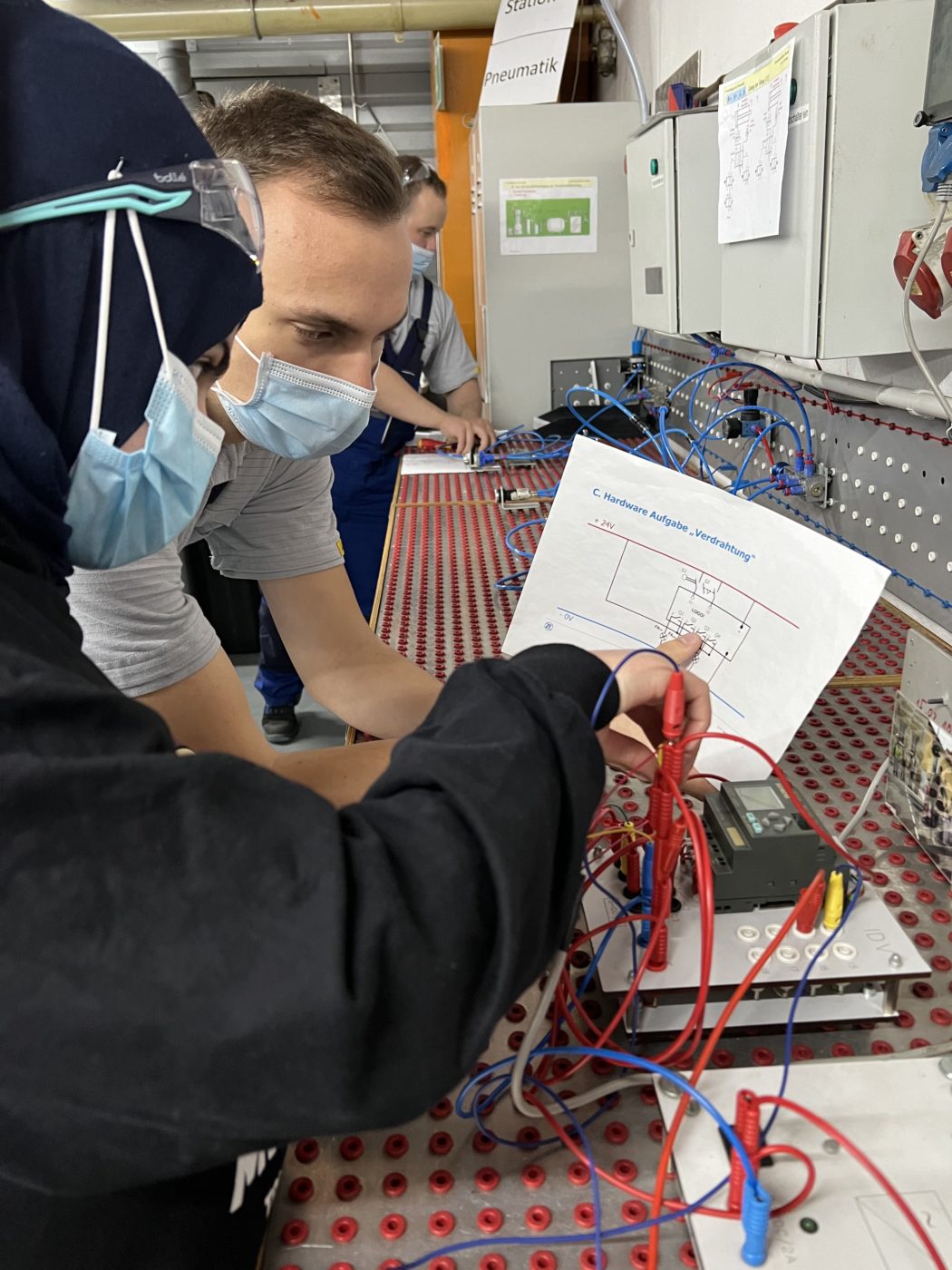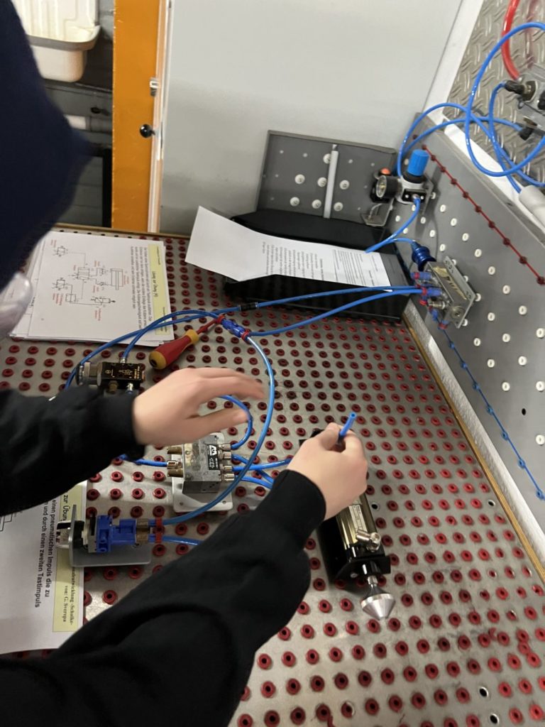 Sie gaben Einweisung in die Funktion und das Bedienen verschiedener Maschinen. Die erste Station war dazu da, manuelle Fertigungsverfahren kennenzulernen und zu erproben. Die Mädchen lernten auch die Bedienung einer Fräse kennen, die mit höchster Präzision, Werkstücke in hoher Stückzahl und kürzester Zeit herstellen kann. Ein weiterer Bereich war die Pneumatik. Hier konnten die Mädchen pneumatische Steuerungen kennenlernen und selbst erproben. Die Funktion einer Drehmaschine wurde den Mädchen ebenfalls nahegebracht. Auch die Steuerung einer Ampelanlage konnte ausprobiert werden. Sie wurden auch an die Hardware Aufgabe der Verdrahtung herangeführt. Sie mussten Schaltpläne lesen lernen und danach korrekt verdrahten.