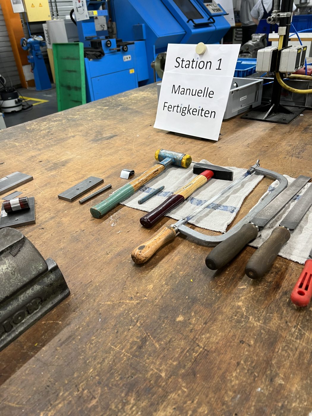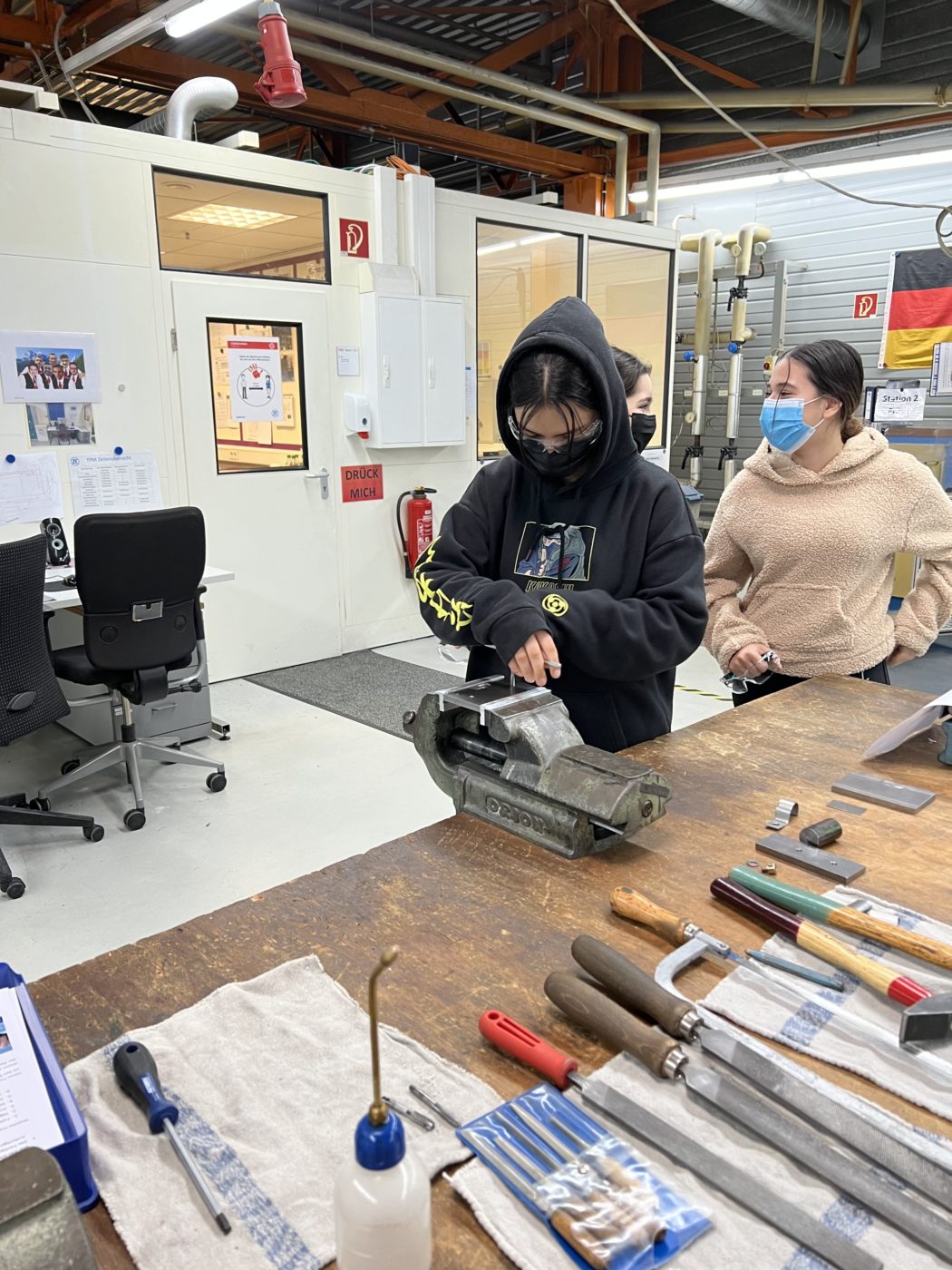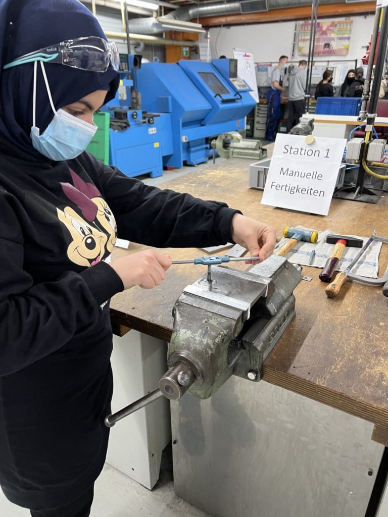 Am nächsten Tag konnten die Mädchen unterschiedliche Betriebe besichtigen und eine Berufsfelderkundung durchführen. Eine Gruppe war bei Automotiv und bekam zunächst eine Einführung über den Betrieb und die möglichen zu ergreifenden Berufe. Diese reichten vom Mechatroniker*in bis zum Ingenieur*in. Auch im Bereich Logistik und Büromanagement gab es Ausbildungsmöglichkeiten. Die Mädchen wurden von Auszubildenden betreut, die ihren Werdegang schilderten und die Mädchen bei dem sich anschließenden Stationen- Parcours unterstützten.