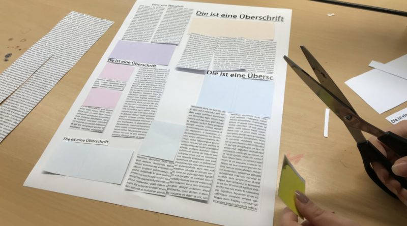 Am 18. Juni bekamen wir dann nochmals Besuch von einer Expertin fürs Zeitungsmachen: Nicole Cub, die für das Layout der KUZ zuständige Mediengestalterin, führte einen dreistündigen Layoutworkshop mit unserem Kurs durch. Nach einer kleinen theoretischen Einführung konnten alle TeilnehmerInnen in kleinen Gruppen selber ausprobieren, wie man am besten Überschriften, Fotos und Textblöcke auf einer Zeitungsseite platziert und ihr Ergebnis den anderen präsentieren.