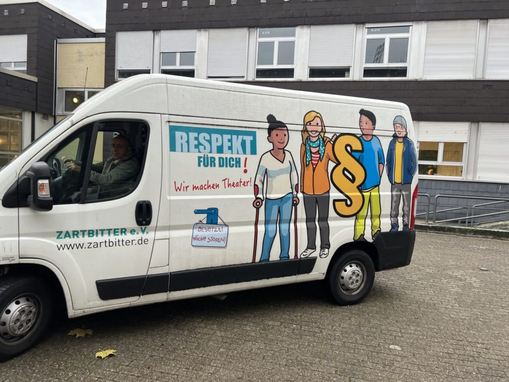Nach einem letzten Kontrollanruf um 8.55 Uhr in der Agentur und der Nachfrage meinerseits, wie weit die Schauspieler noch von der GSÜ entfernt seien, stand plötzlich, wie von Zauberhand, der bunte Tourenbus von „Zartbitter“ vor der Aula der GSÜ.