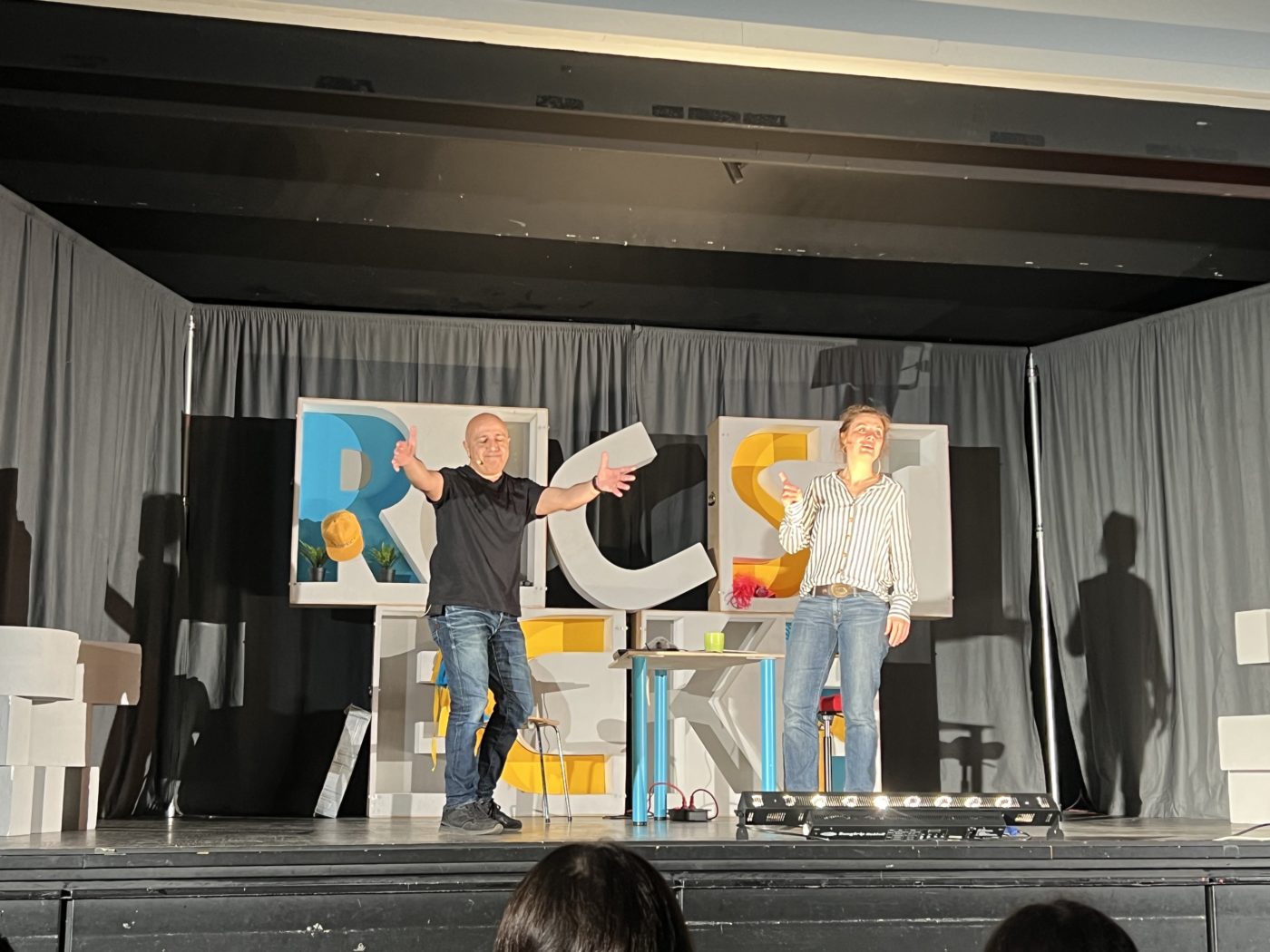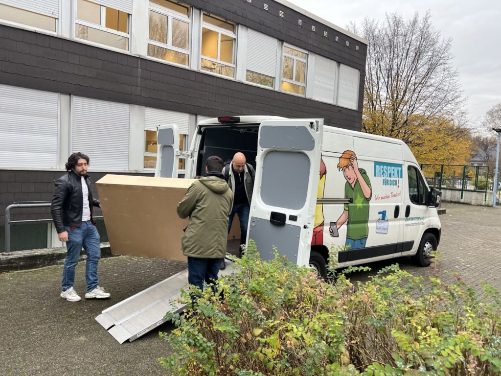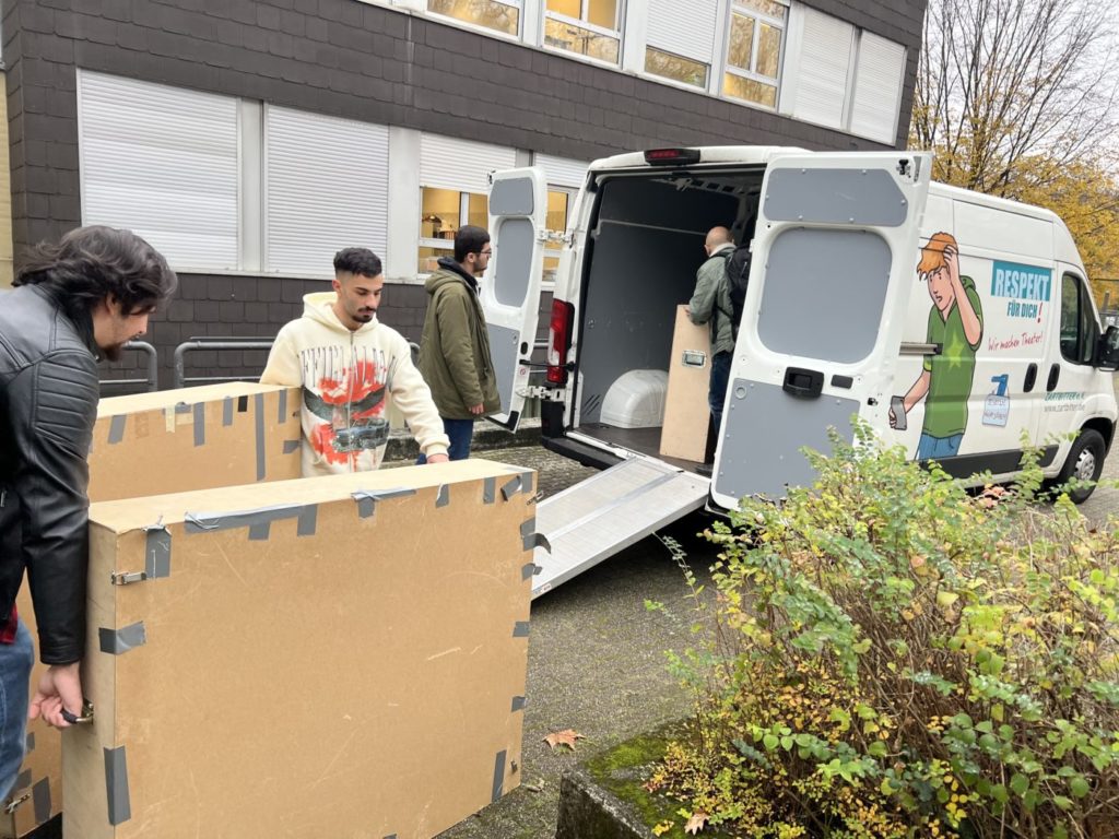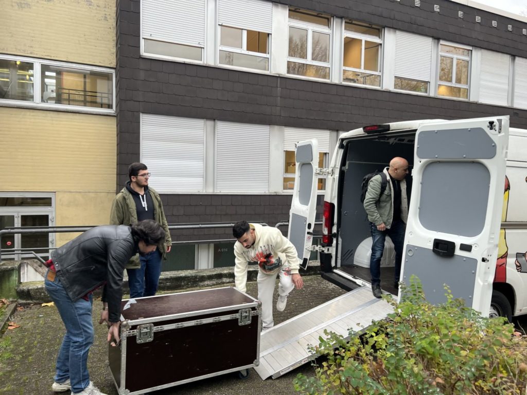 Es stiegen zwei gut gelaunte Schauspieler*innen aus, die pünktlich wie die Maurer ihr gesamtes Equipment aus dem Bus luden. Die vier tatkräftigen Helfer Polat, Riza, Elias und Manvel waren ebenfalls präsent und startklar. Ein großes Dankeschön an dieser Stelle an die „tatkräftigen Jungs“ der Oberstufe.