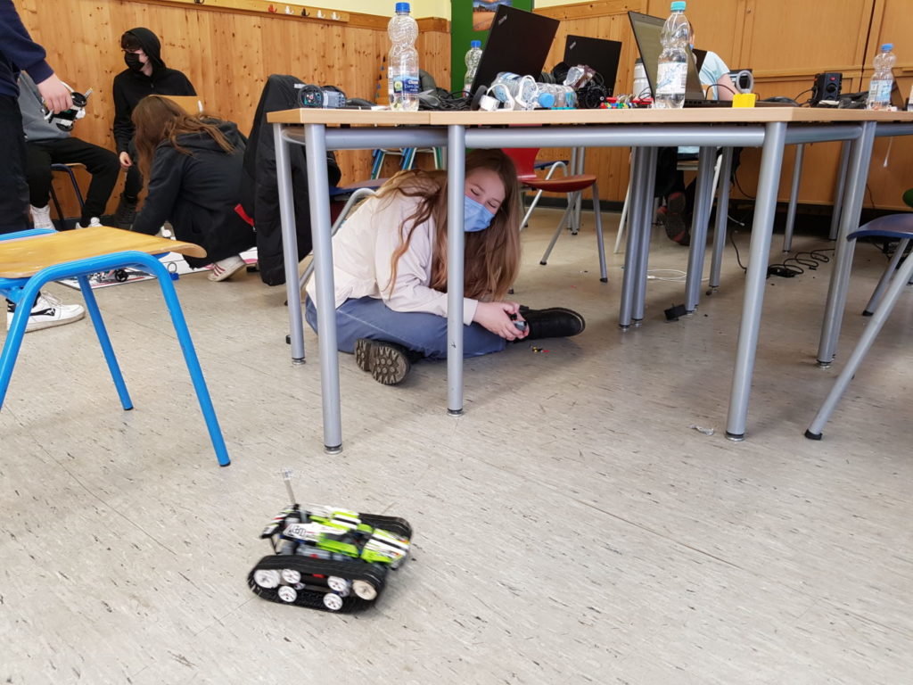 Was die Arbeit mit den Robotern angeht, so gilt ein Ausspruch von Thomas Edison: „Genie ist zu ein Prozent Inspiration und zu neunundneunzig Prozent Transpiration.“ Und sowohl viel Einsatz als auch geniale Ideen haben die SchülerInnen zur Genüge bewiesen (glücklicherweise jedoch ohne die von Edison benannte olfaktorischen Elemente). Arbeitsteilig entwickelten sie sowohl Konstruktionen als auch Programme, damit der Roboter im beim Wettbewerb geltenden Zeitlimit von zweieinhalb Minuten möglichst viele Aufgaben löst. Daher flitzten nach kurzer Zeit allerlei selbst erdachte Konstruktionen auf zwei, drei, vier Rädern oder gar mit Kettenantrieb herum und schoben, griffen und transportierten Steine auf dem Spielfeld hin und her. Doch damit nicht genug: beim Wettbewerb darf nur ein einziger Roboter verwendet werden, der alle Aufgaben lösen kann. Daher galt es im Anschluss, Kompromisse zu schließen und einen Roboter zu konstruieren, der die Anforderungen aller Programme bewältigen kann und dabei zugleich leicht und klein bleibt.