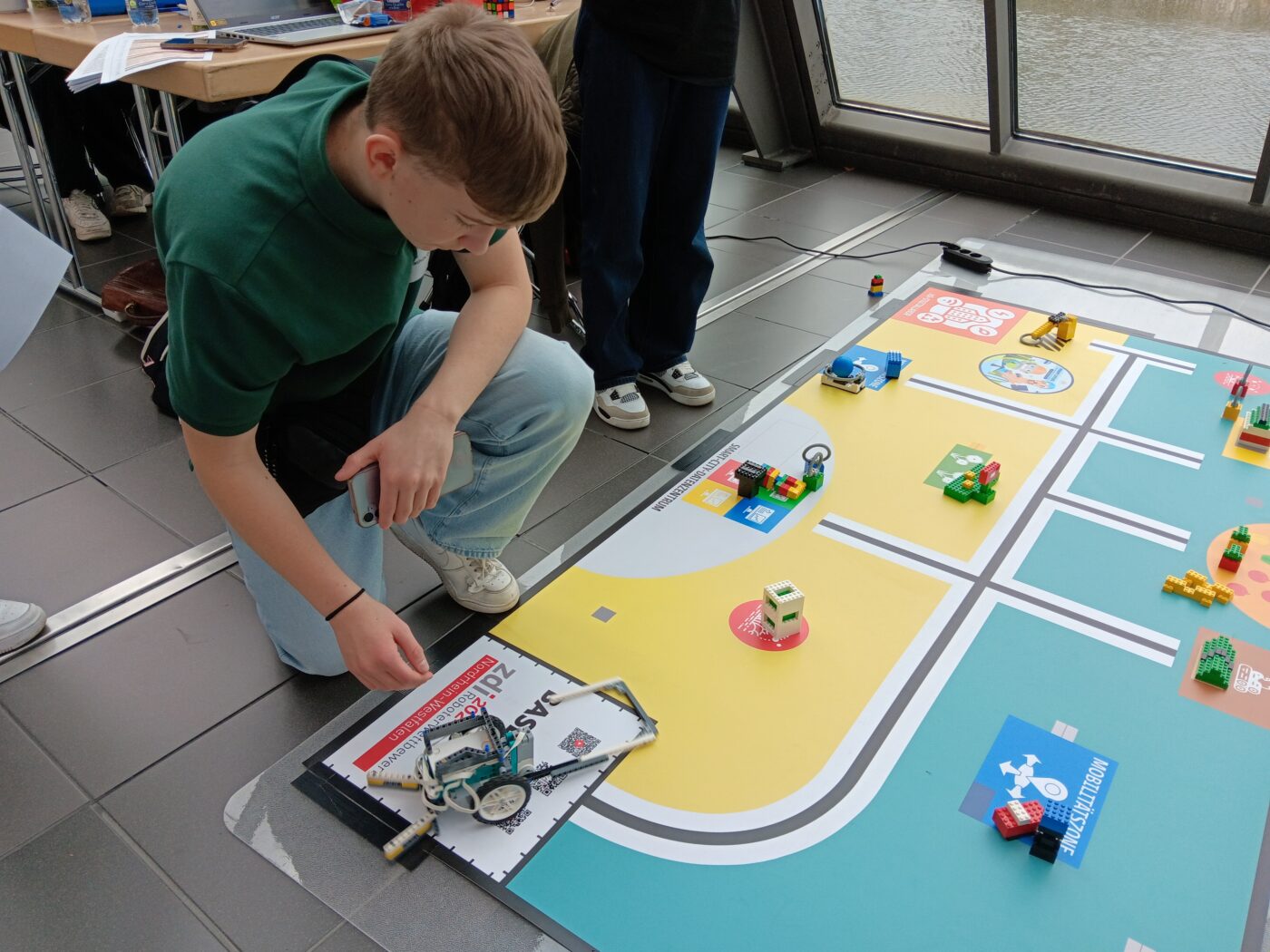Unser Team startete den Wettbewerb mit einem exzellenten Lauf, der uns mit 116 Punkten auf Platz 3 aller Teilnehmer brachte. Nach jedem Lauf hatten die Schülerinnen und Schüler Gelegenheit, Veränderungen am Roboter vorzunehmen und Trainingsläufe zu absolvieren. Gewertet wurden am Ende die besten zwei aus drei Läufen.