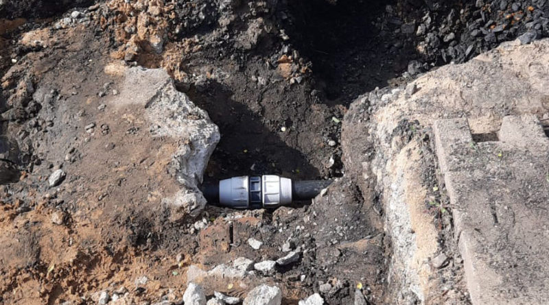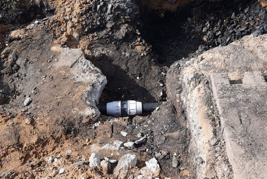 Das Wasserrohr sieht gar nicht so groß aus, aber tatsächlich hängt die gesamte Versorgung der Schule von dieser Leitung ab. Heute gegen 9:30 wurde die Leitung bei Baggerarbeiten geschädigt. Die Leitung musste nach der Pause geschlossen werden, damit das ausfließende Wasser keine weiteren Schäden anrichtet.