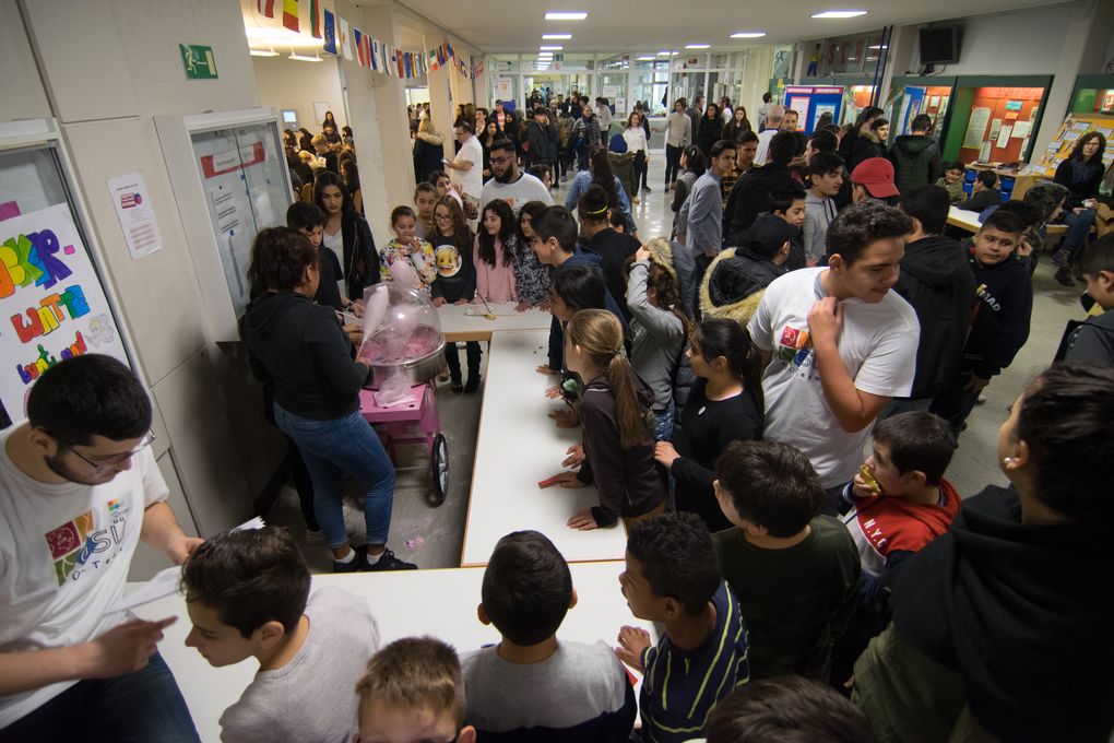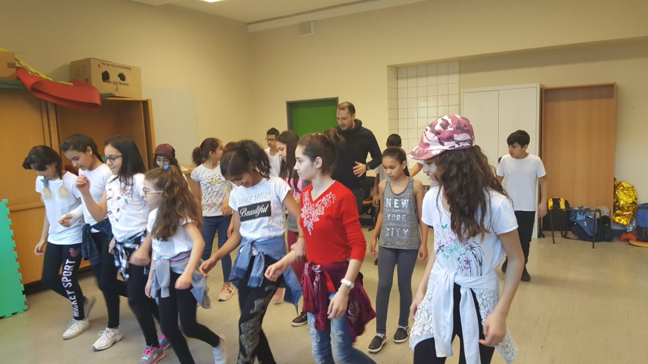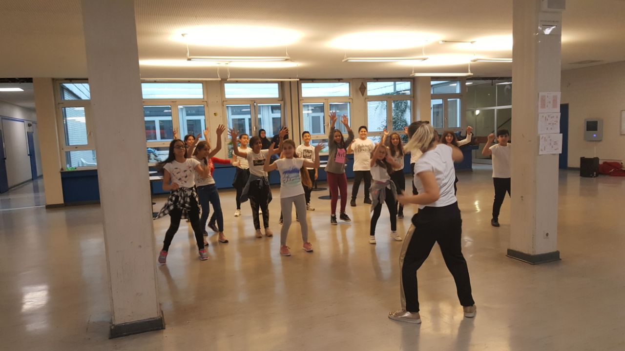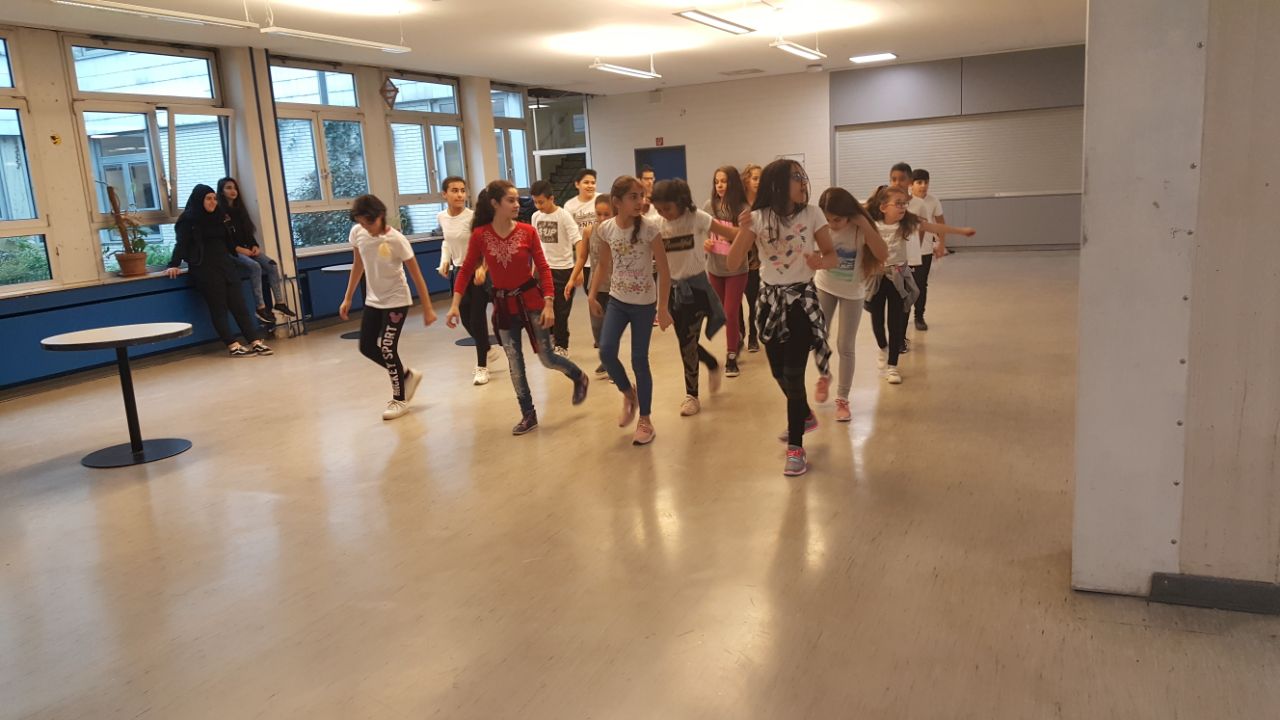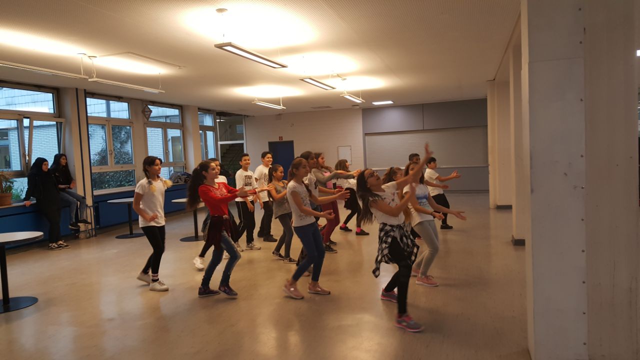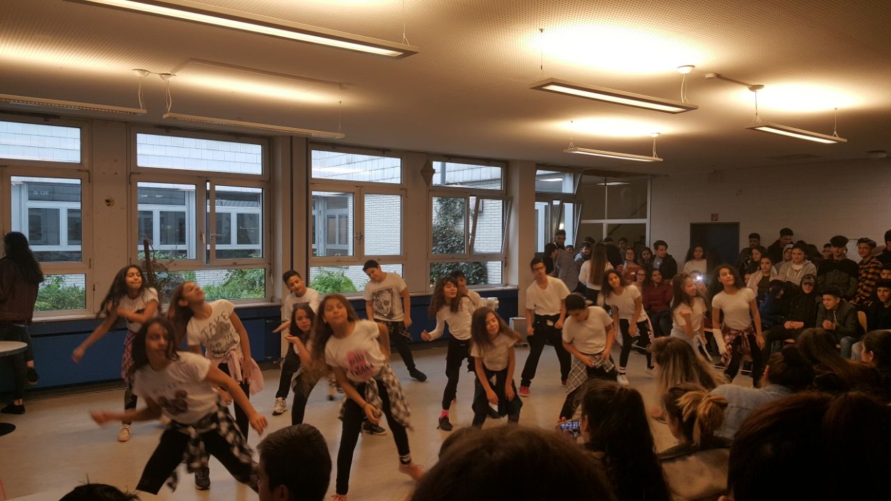 Bereits um 9:00 Uhr war das Hauptfoyer der GSÜ gut gefüllt. Das Internationale Buffet füllte sich und die Popcorn-Maschine lief warm. Weitere Stände wurden aufgebaut und Tänzer probten nochmal schnell ein paar Schritte. Im gesamten Gebäude präsentierten die Klassen und Kurse die Ergebnisse der Projekttage, in denen von Dienstag bis Donnerstag die Vorbereitung auf den Festtag erfolgte.So z.B. die I-Fö A2 mit ihren interkulturellen Tänzen. Die SuS haben durch die Tänze die Möglichkeit erhalten in andere Kulturen einzublicken sowie evtl. vorhandene Vorurteile abzubauen. Unter der professionellen Leitung einer Tanzpädagogin hat die Zusammenarbeit den Kindern großen Spaß bereitet.