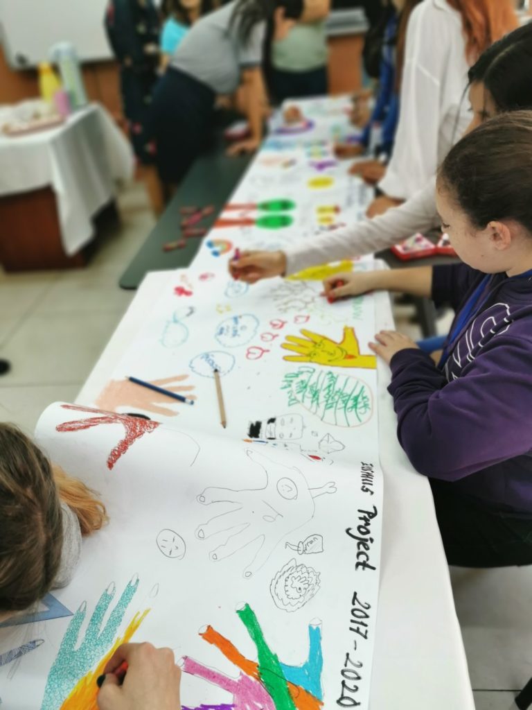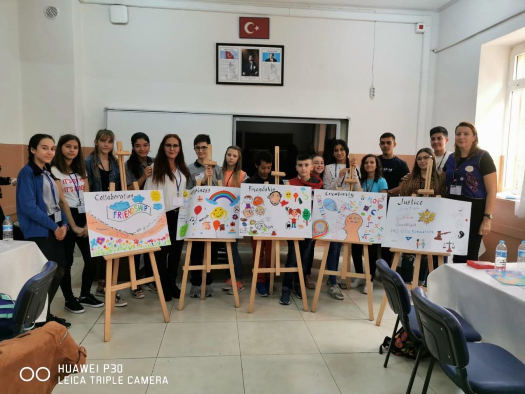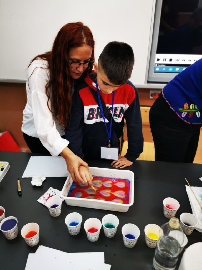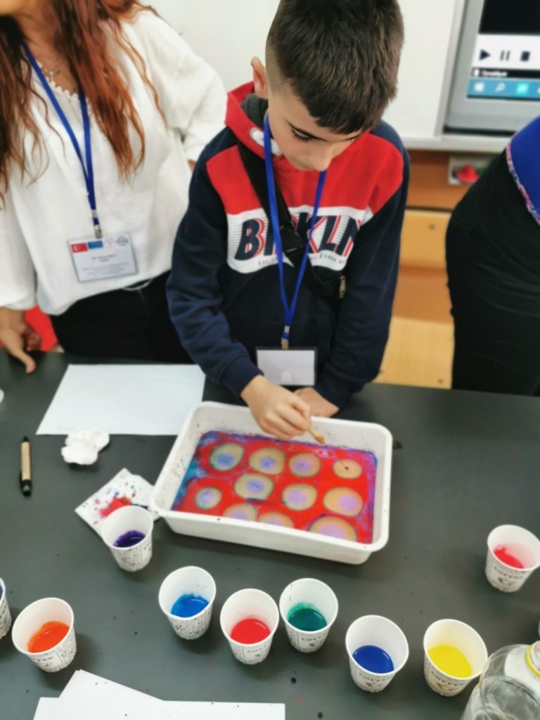 Am Montag begrüßten uns die Kinder in der Schule mit türkischen Volkstänzen und Liedern. Nach den Aufführungen wurde das aus dem asiatischen Raum stammende Handwerk des Marmorierens vorgestellt. Beim Ausprobieren der Technik hatten die Schülerinnen und Schüler großen Spaß. Voller Bewunderung betrachteten sie ihre farbenprächtigen Bilder. Nach dem Mittagessen stand die Freundschaft im Vordergrund. Es wurden Bilder gemalt und Plakate zu den Werten wie Respekt, Verantwortung, Hilfsbereitschaft, Ehrlichkeit oder Toleranz hergestellt.