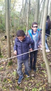 Das Gruppengefühl der Schülerinnen und Schüler konnte direkt zu Beginn des Ausflugs getestet und gestärkt werden. In Zweiergruppen haben sich die Kinder der 5/1 auf den Weg durch den Wald gemacht. Auf unbefestigten Pfaden ging es an einem Seil in die Dunkelheit. Die Hälfte der Schülerinnen und Schüler trugen Augenbinden und wurden von dem Rest entlang des Seils geführt. So konnten nicht nur soziale Kompetenzen vertieft, sondern auch die Natur mit „ganz anderen Augen“ gesehen werden – Oder eben ohne. Gerüche, Geräusche und Bodenbeschaffenheiten wurden verstärkt wahrgenommen und benannt.